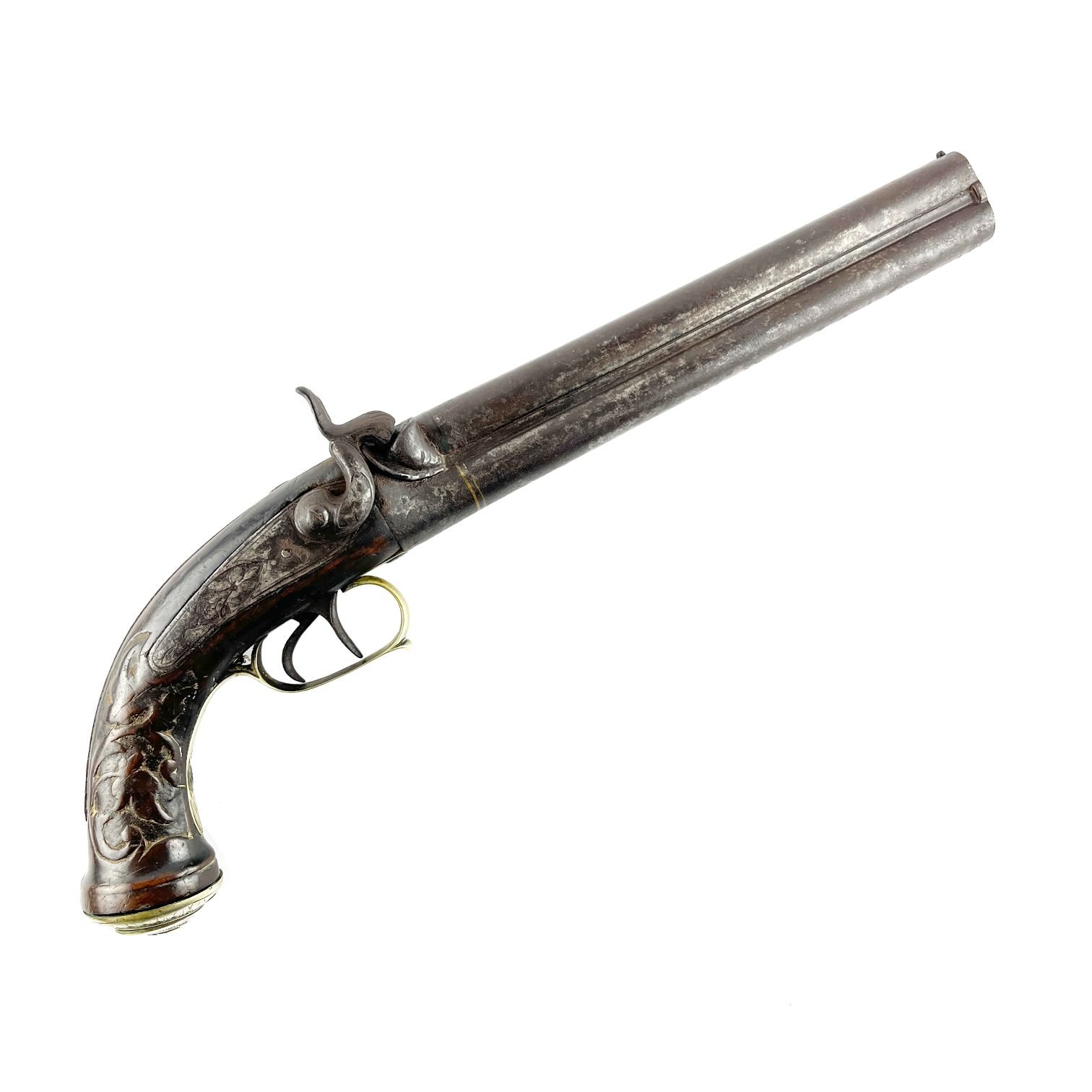 Pistola de avancarga sistema de percusión. Dos caños superpuestos calibre 15 mm. Guardamonte y pomo portafulminantes en alpaca cincelada. Funcionando. Largo 40 cm.