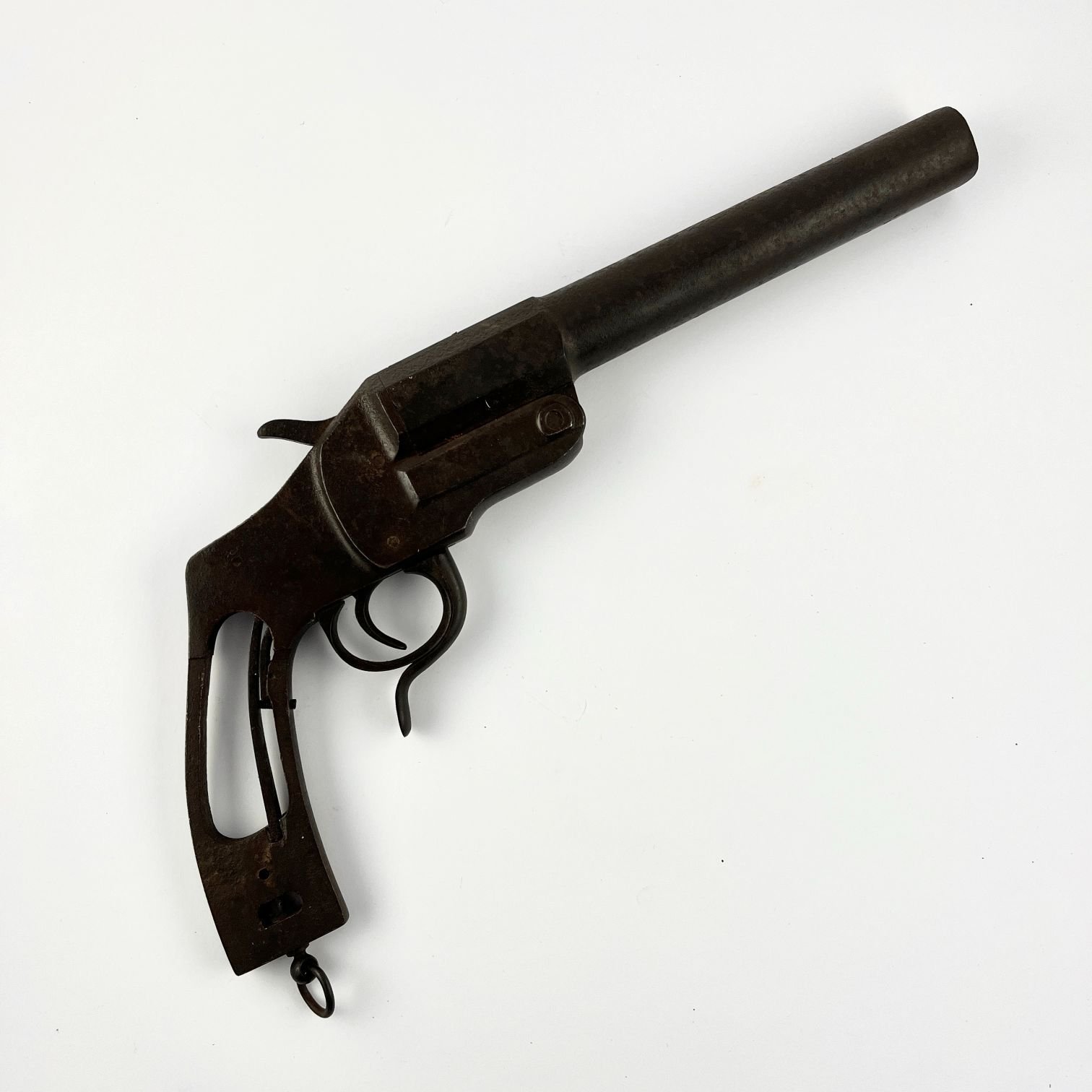 Pistola de señales alemana en hierro con seccion de caño hexagonal. Faltan cachas. Funcionando. Largo 36 cm.