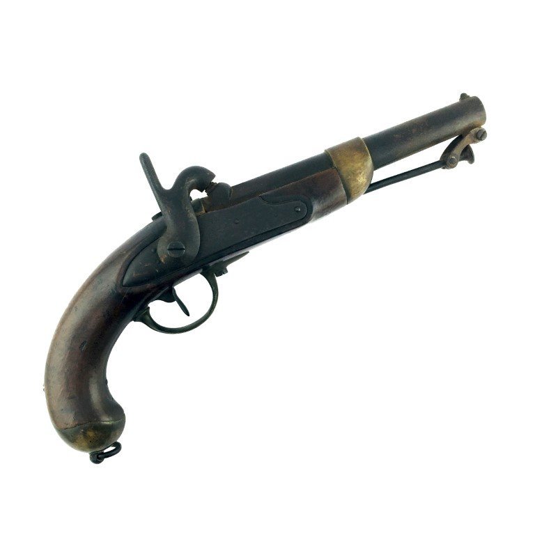Pistola francesa para caballería de avancarga sistema de percusión. Fabricada en Châtellerault. Con marcas regimentales en madera y hierro. Con baqueta articulada. Funcionando.