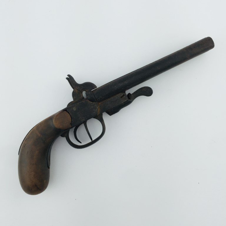 Pistola belga sistema Lefaucheux. Dos caños yuxtapuestos. Calibre 12 mm. Empuñadura en madera lisa, averiada. Largo 25 cm.