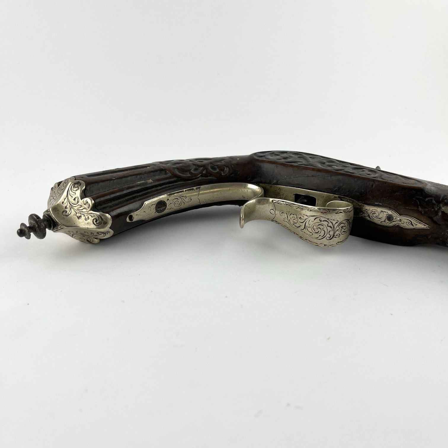 Pistola monotiro calibre 6 mm Flobert. Caño octogonal. Empuñadura en madera tallada. Pomo y guardamonte en alpaca cincelada «arabescos». Largo 37 cm. Funcionando.