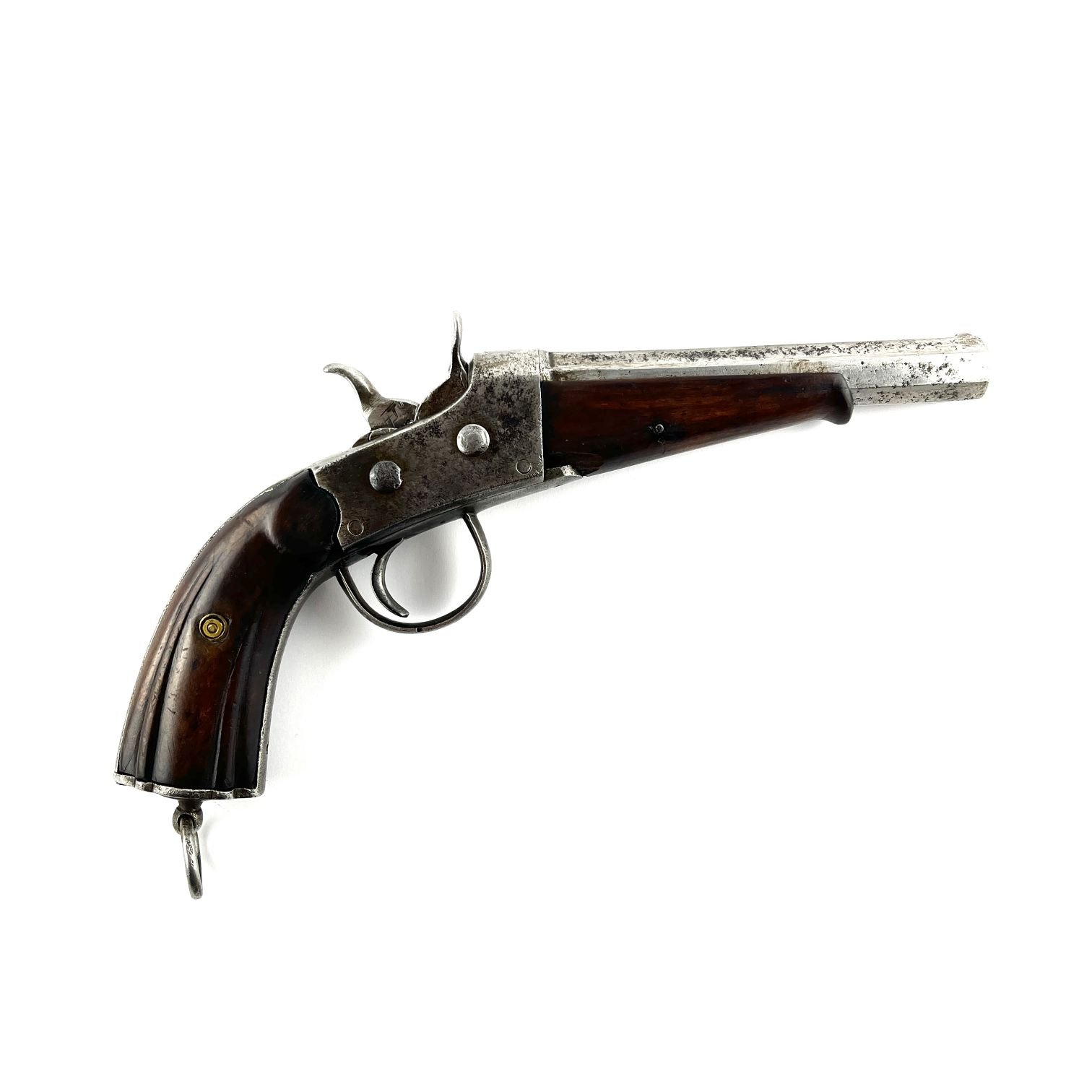 Pistola belga sistema Rolling Block calibre 36. Caño hexagonal de 5.5 pulgadas. Chimaza y cachas en madera lisa. Funcionando.