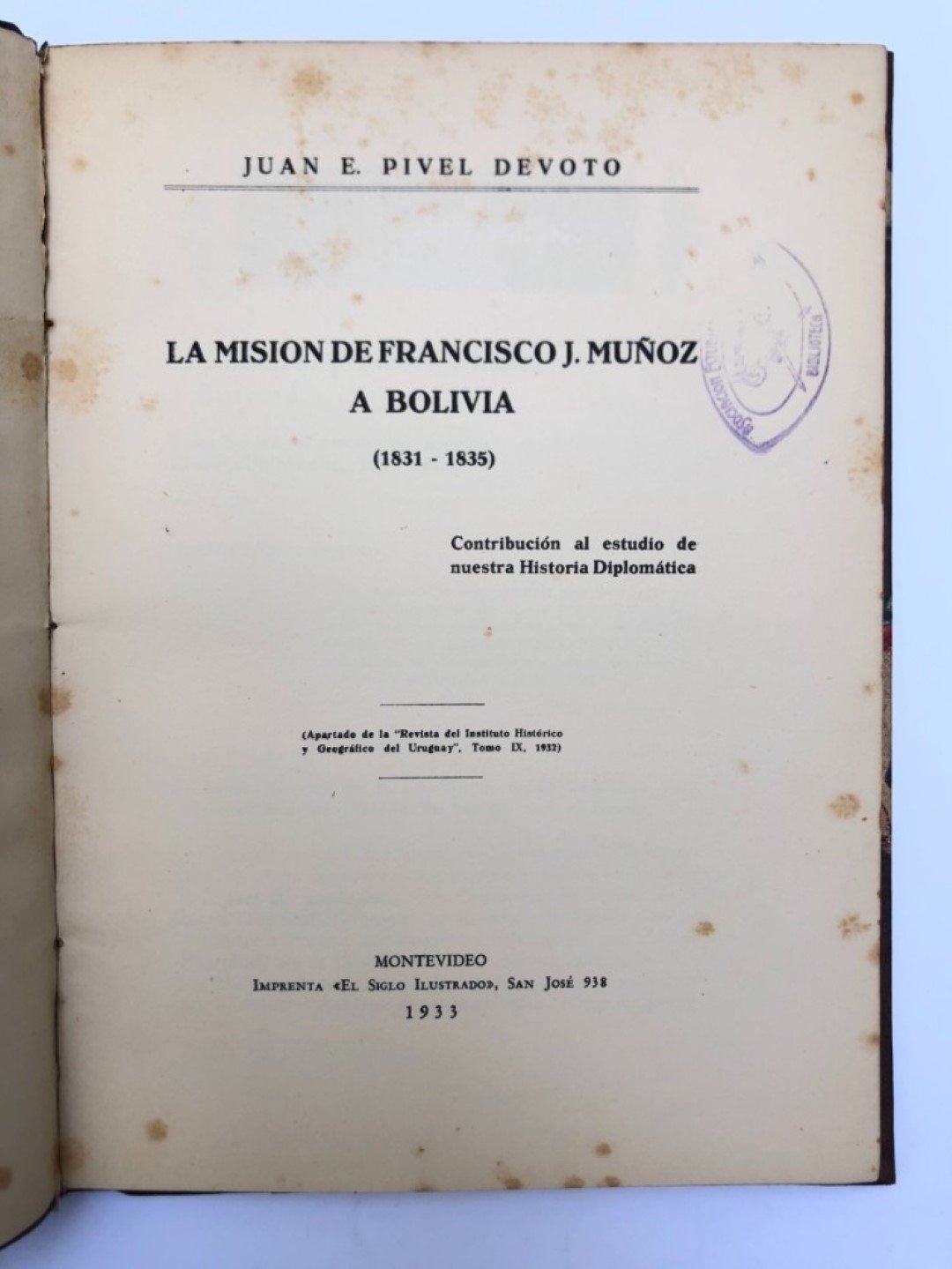 PIVEL DEVOTO, Juan: La misión de Francisco J. Muñoz a Bolivia (1831-1835). Montevideo, Imprenta El Siglo Ilustrado. 1933. Encuadernación con lomo de cuero. Junto con: PIVEL DEVOTO, Juan: La misión de Nicolás Herrera a Río de Janeiro (1829-1830). Montevideo, Imprenta El Siglo Ilustrado. 1932. Encuadernación con lomo de cuero. Junto con: PIVEL DEVOTO, Juan: Los bancos 1824-1868. Montevideo, Talleres Gráficos de A. Monteverde y Cia. 1976. Encuadernación en tres cuartos de cuero. Con sus tapas originales con manchas de humedad.