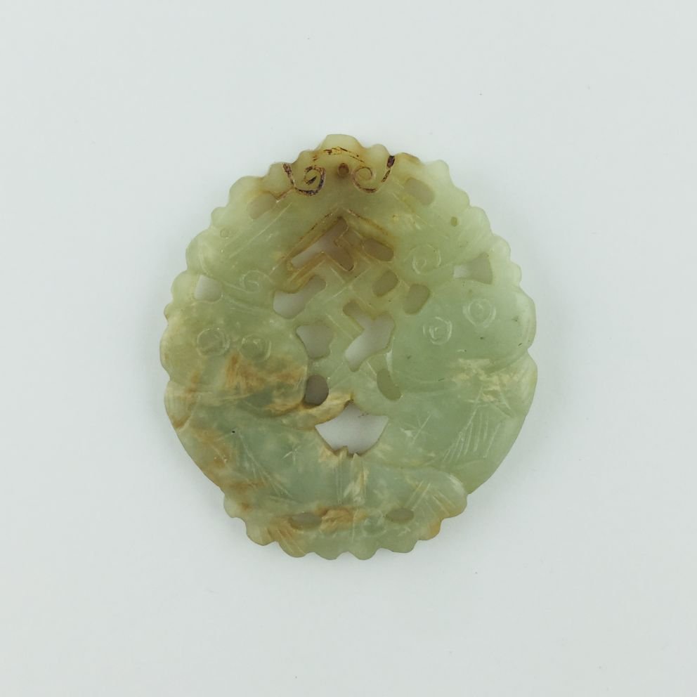 Colgante chino en jade tallado y calado «dragones Qiulong y cruz gamada». 5 x 4.5 cm.