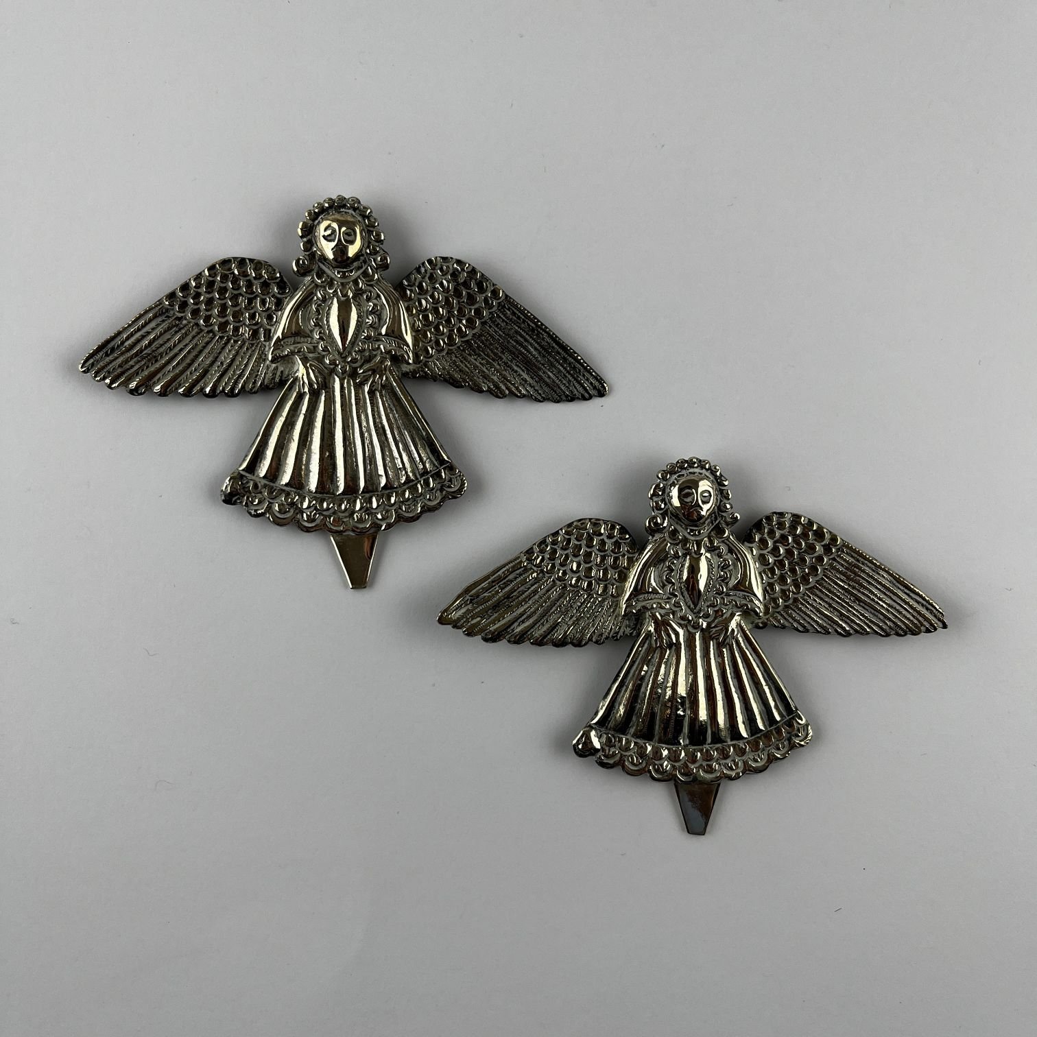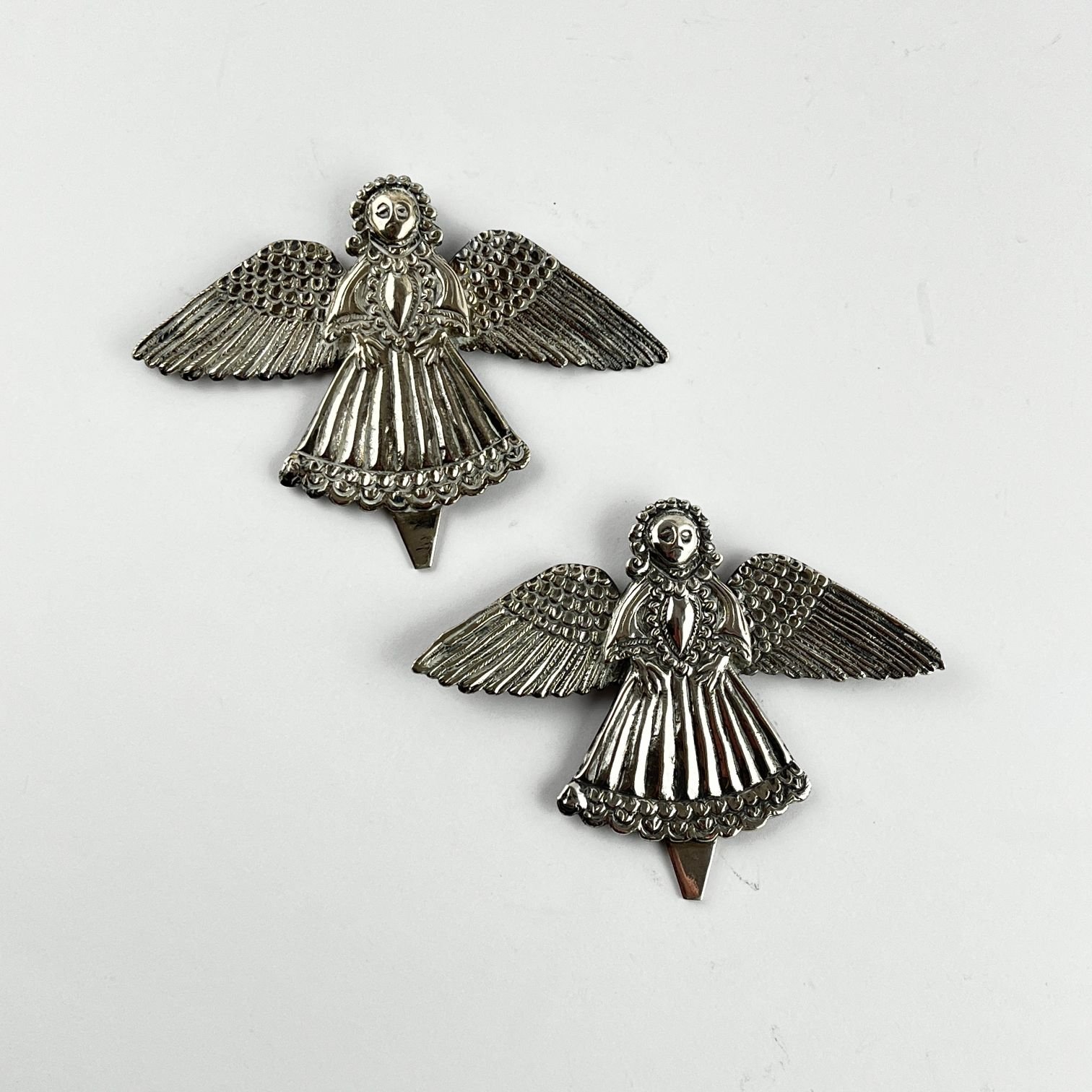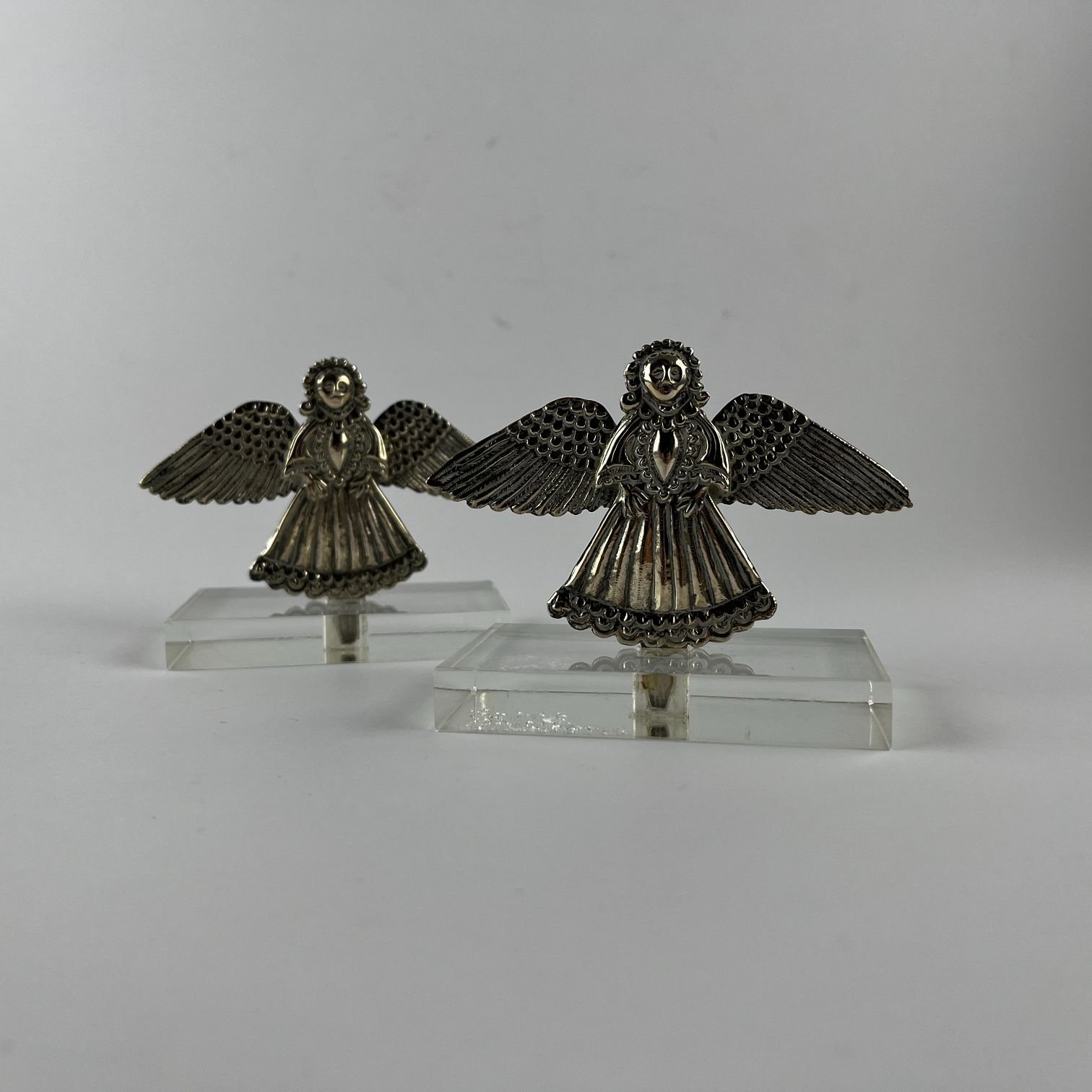 Par de pequeñas placas hispanoamericanas s. XVIII en plata esculturada “ángeles”. 7 x 9 cm. Presentadas en base de acrílico.