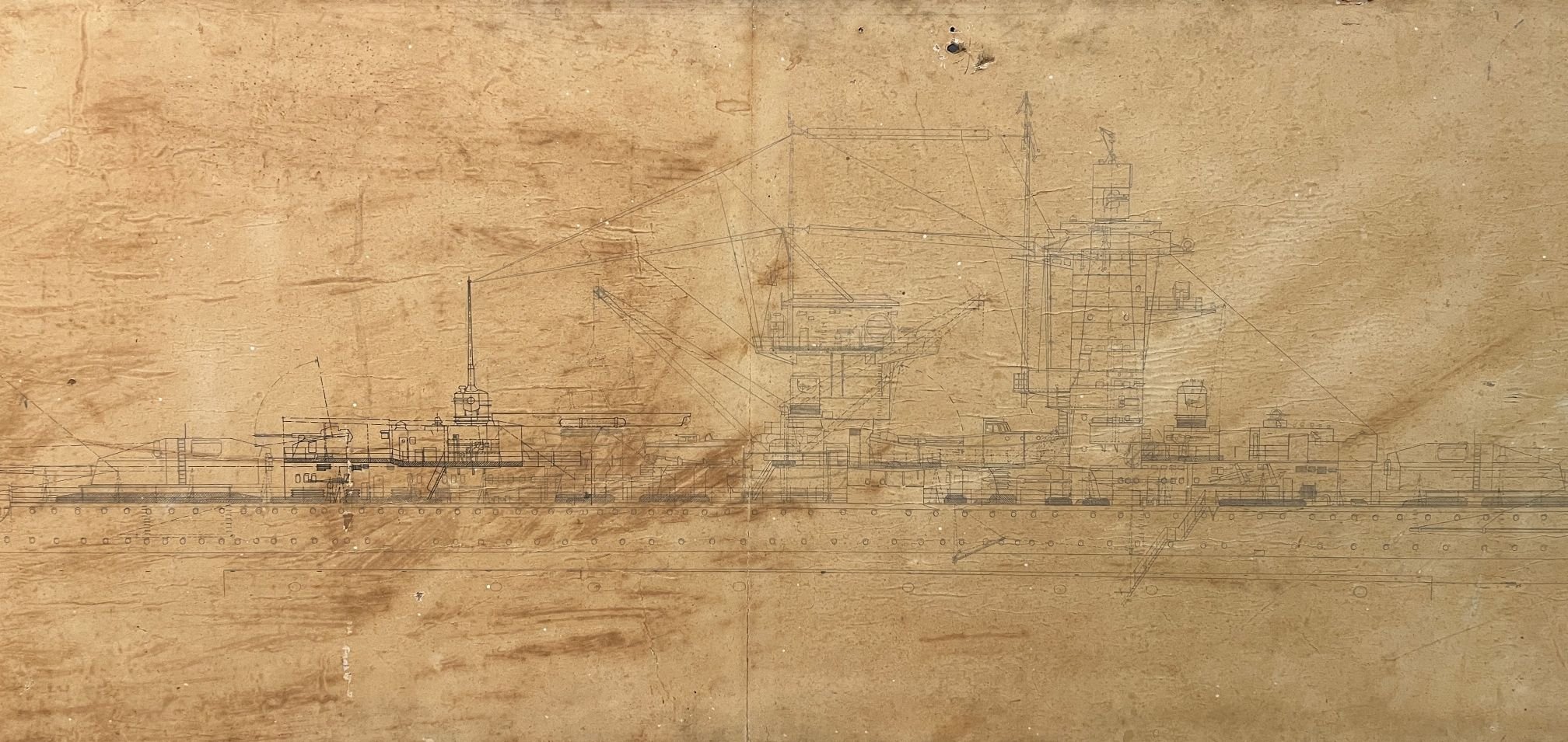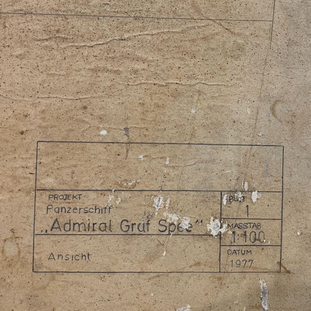 Plano a escala 1/100 del acorazado alemán Admiral Graf Spee realizado a lápiz y tinta sobre papel, pegado en madera. Firmado «Ansicht» y fechado «1977». 54 x 198 cm.
