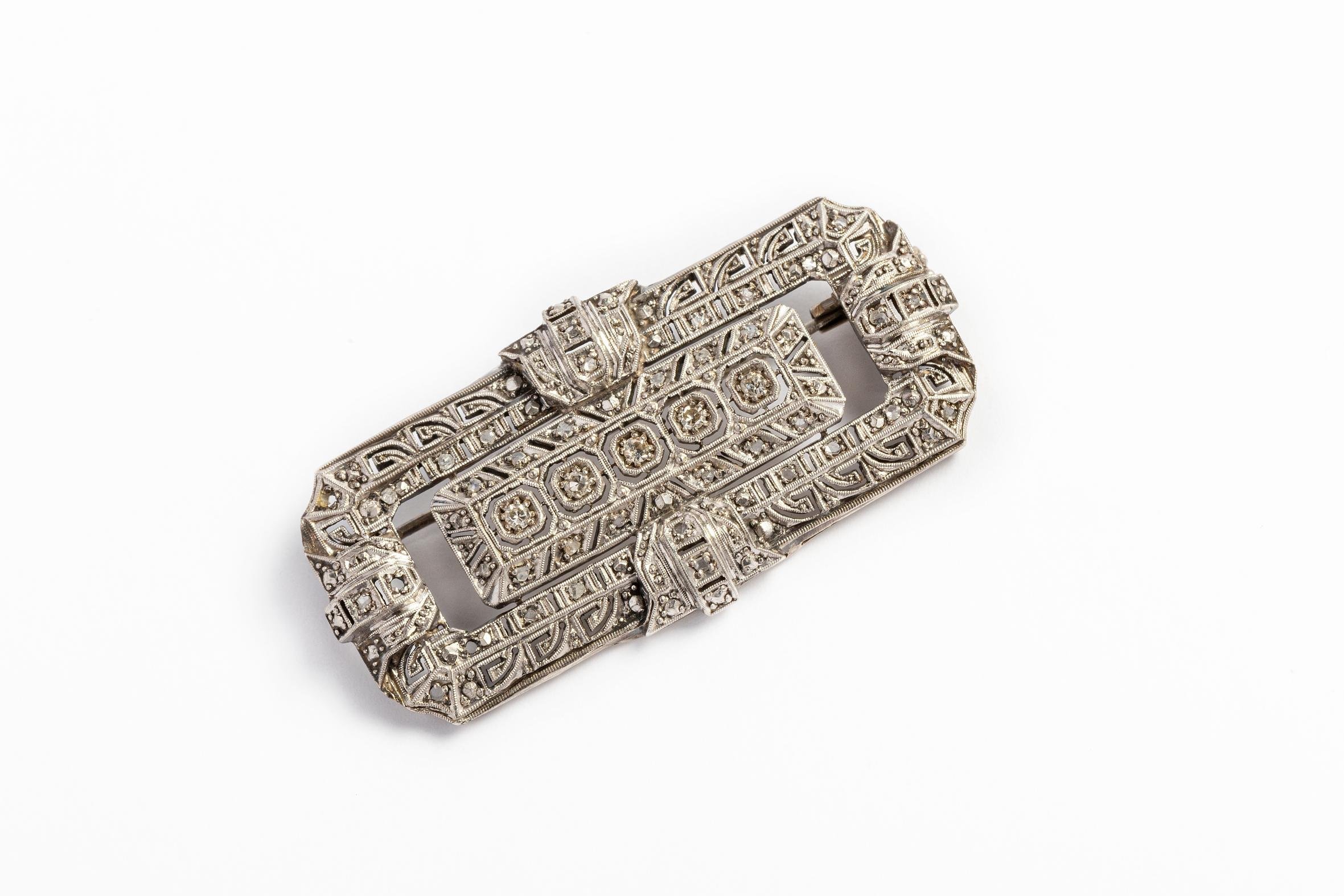 Plaqueta art decó en oro 18 K blanco con cinco pequeños brillantes centrales y varios diamantes (faltan tres diamantes). 25 x 50 mm. peso bruto 9 gr.
