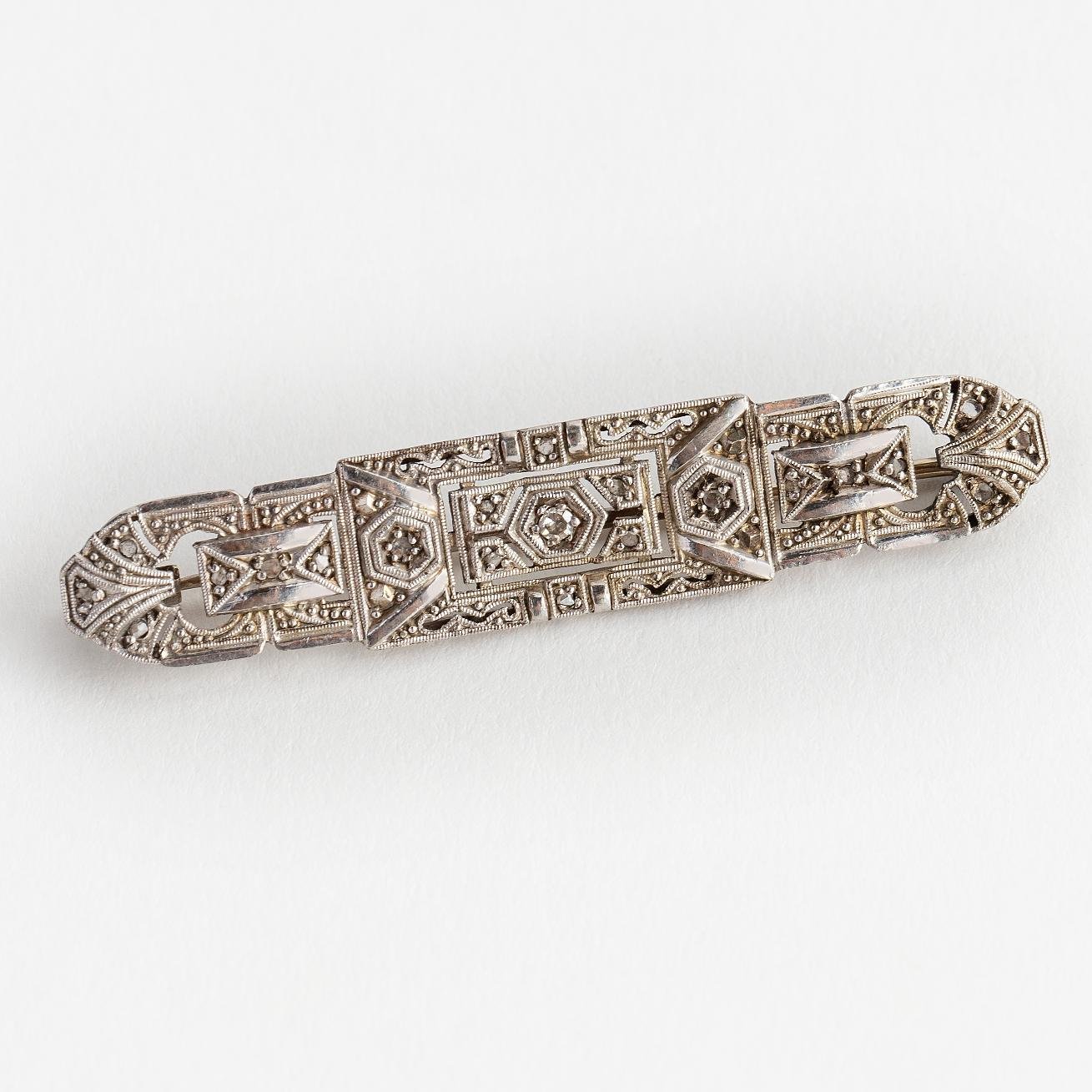 Plaqueta art decó en oro 18 K blanco totalmente decorada con diamantes y un brillante central. 11 x 54 mm. Peso bruto 5 gr.
