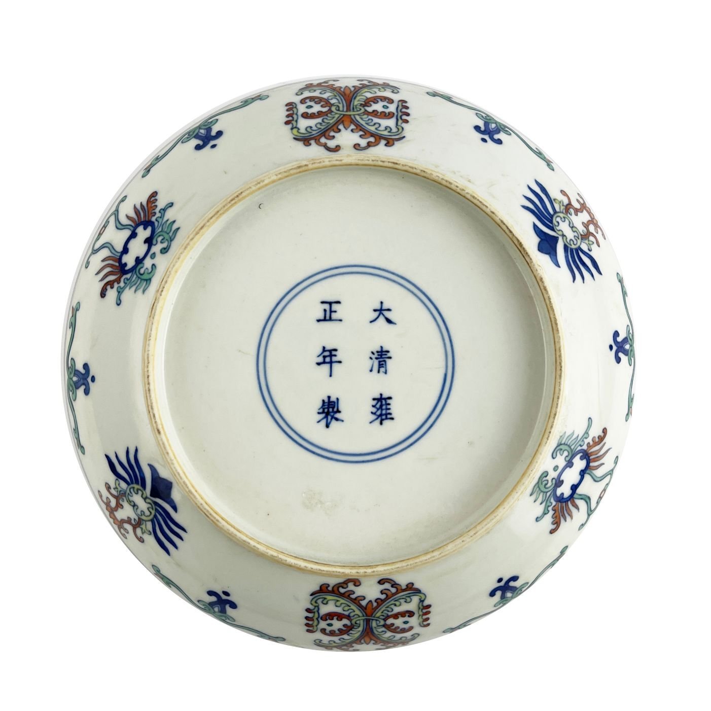 Plato chino en porcelana decorada con paleta wucai. Base con doble círculo y símbolos del emperador Yongzheng. 4.2 x 21 cm.