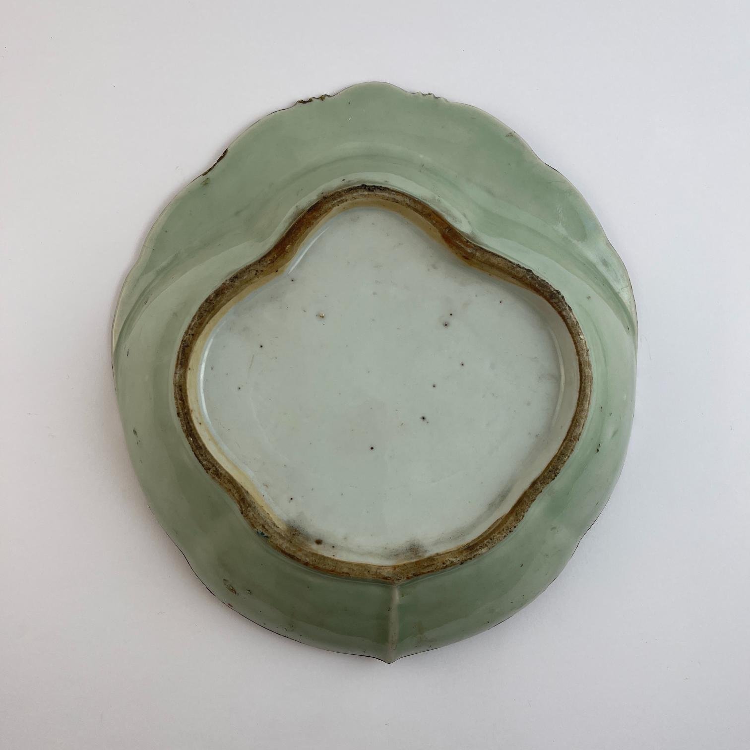 Plato hondo en porcelana china Cantón s. XIX decorado «aves y flores» sobre base color celadón. 25 x 25 cm.