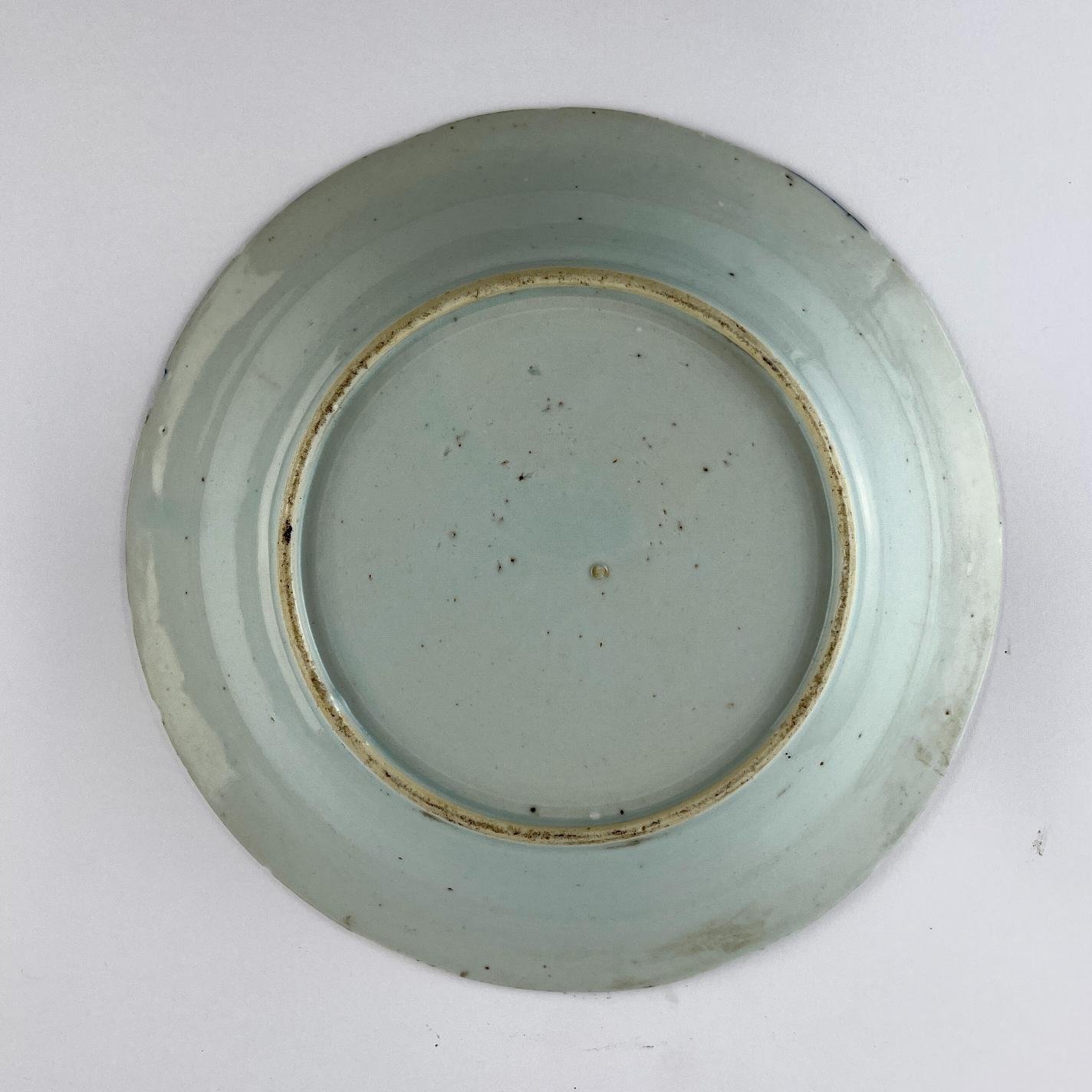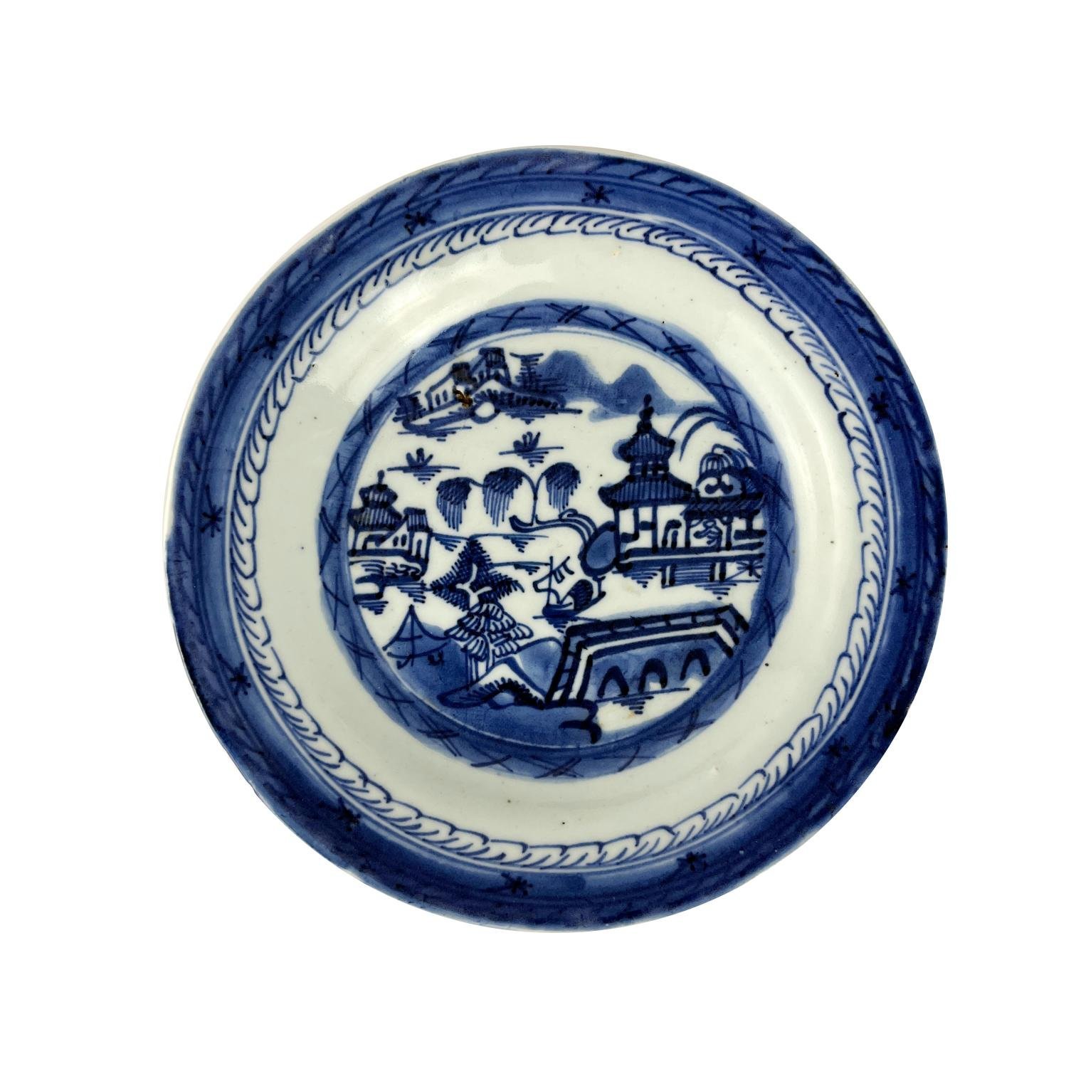 Plato chino c. 1800 en porcelana de Macao azul y blanca decorada «paisaje». Diámetro 22 cm.