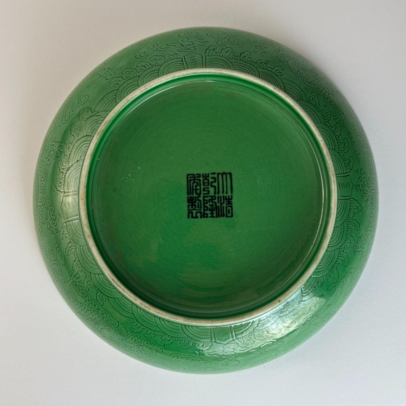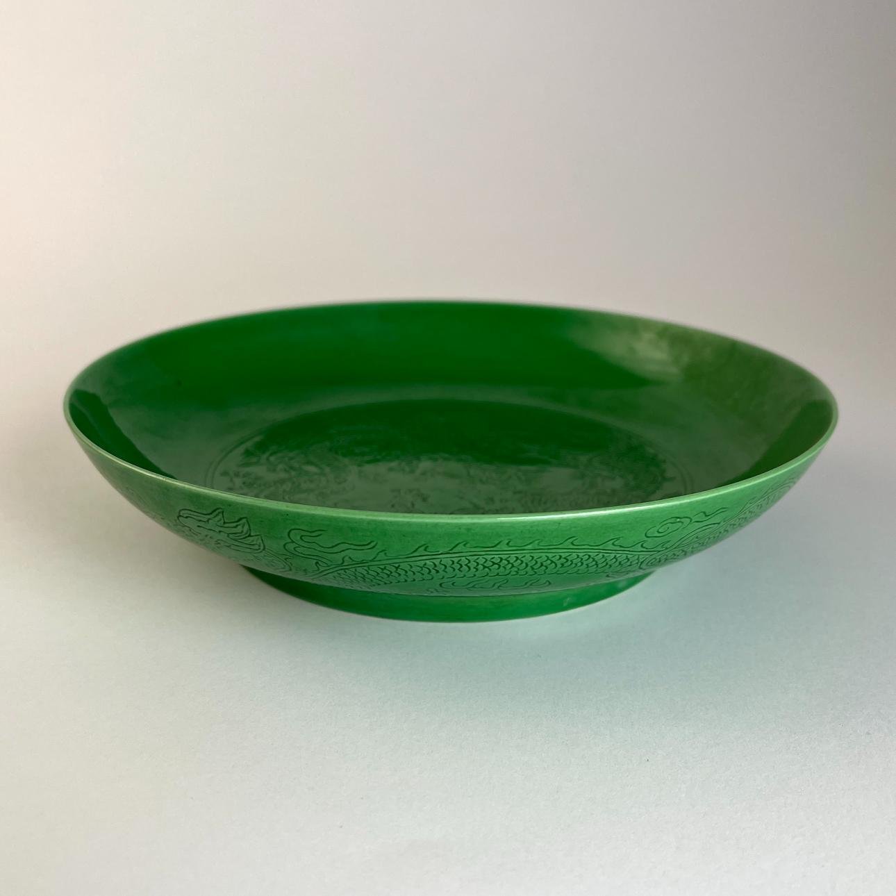 Plato chino en porcelana vidriada en color verde, inciso «dragones persiguiendo la perla». Base con sello estampado del emperador Qianlong, en negro. 4 x 17 cm.
