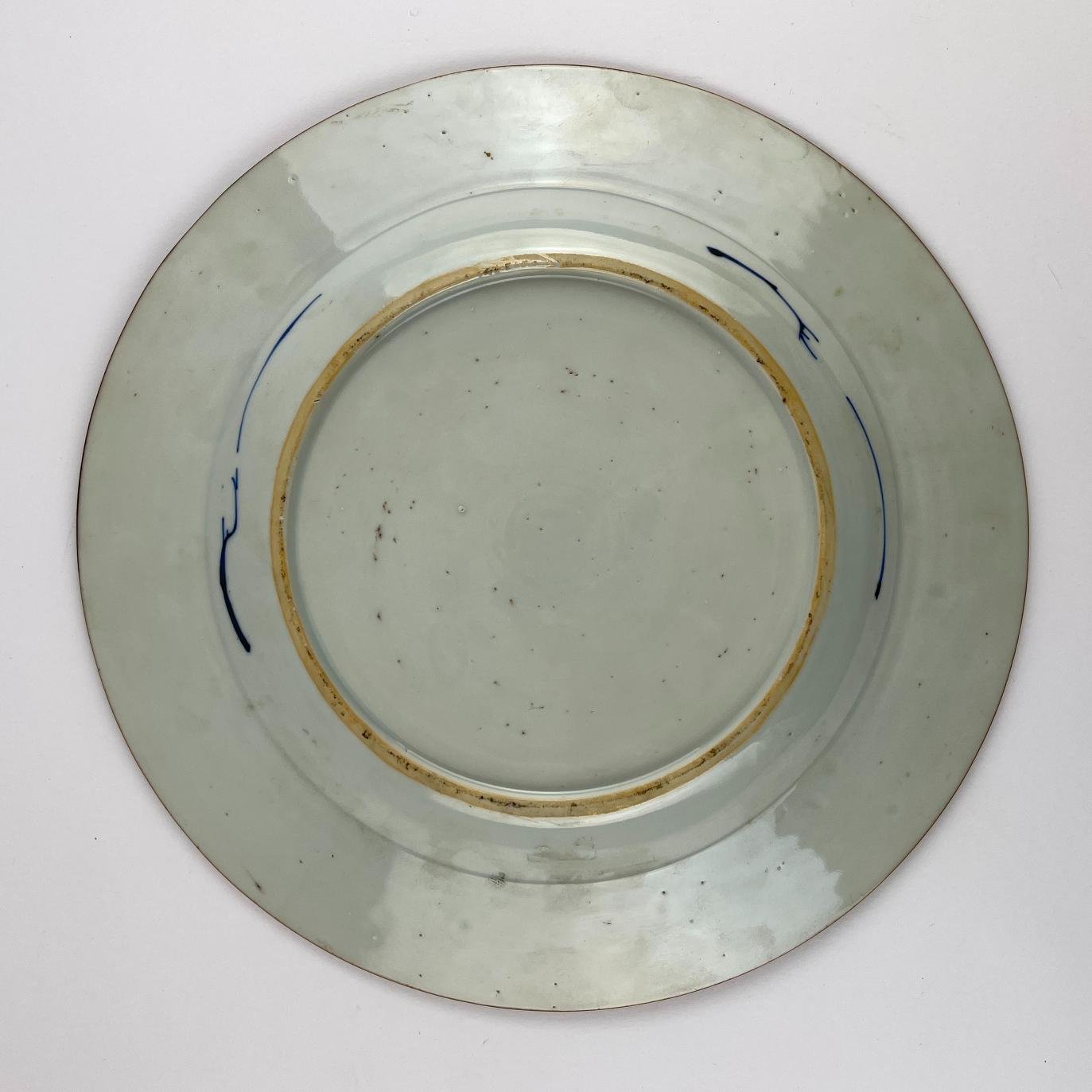 Plato chino en porcelana Compañía de Indias s. XVIII, período Qianlong, decorado «rosa, peonía y crisantemo» en paleta Imari. Diámetro 22,5 cm.