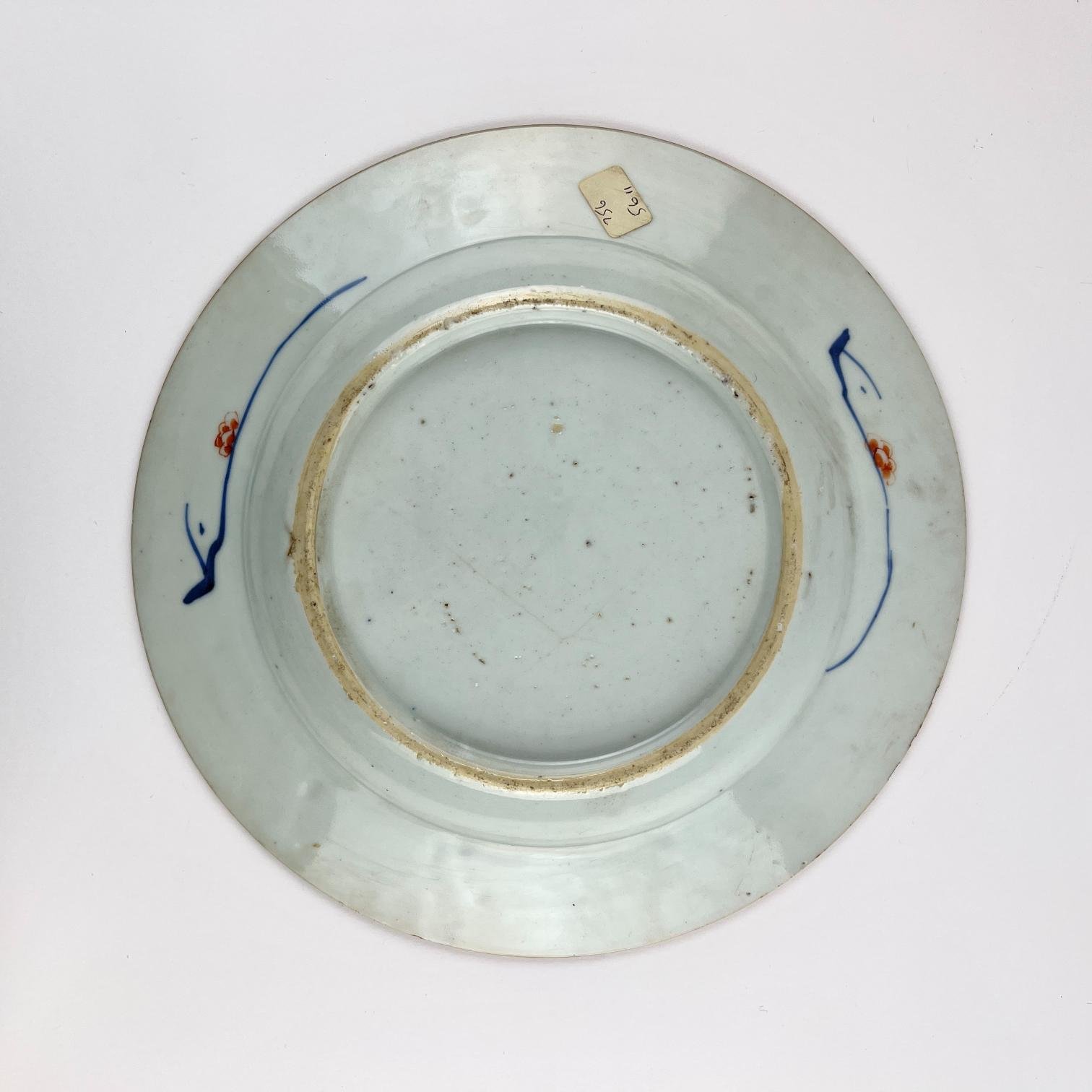 Plato chino en porcelana Compañía de Indias s. XVIII, período Qianlong, decorado «paisaje con cerca» en paleta Imari. Diámetro 225 cm.