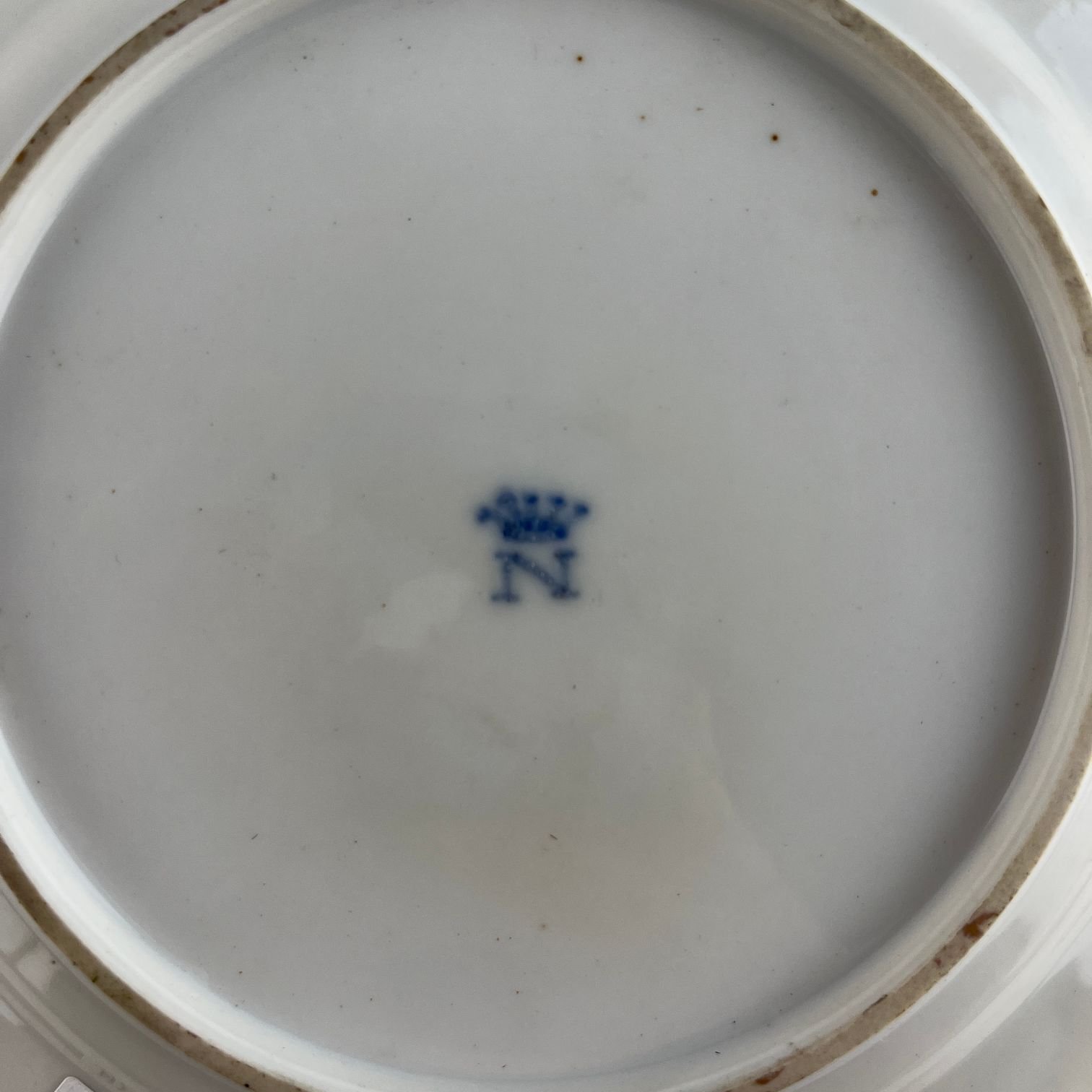 Plato italiano en porcelana Capodimonte pintado a mano «blasón». Borde en ondas decorado “escena galante”. Diámetro 20 cm.