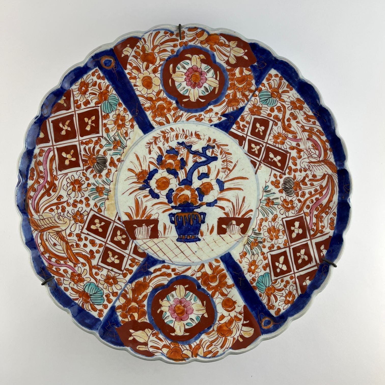 Plato japonés en porcelana Imari decorado «jarrón con flores», con borde lobulado en crisantemo. Diámetro 40 cm.