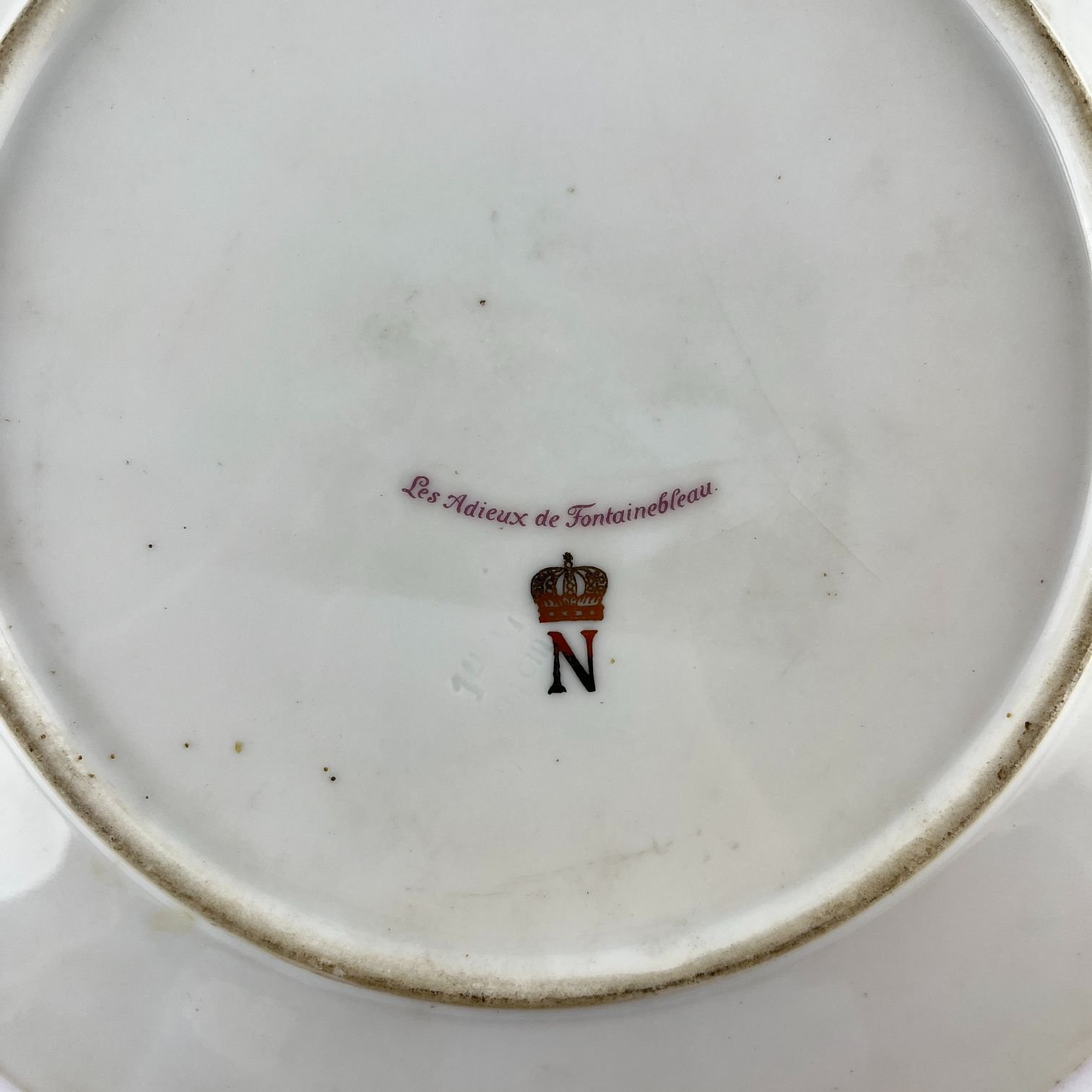 Plato en porcelana Napoleón. «Les adieux de Fontainebleu.» Guarda color verde con detalles en oro. Diámetro 21.5 cm.