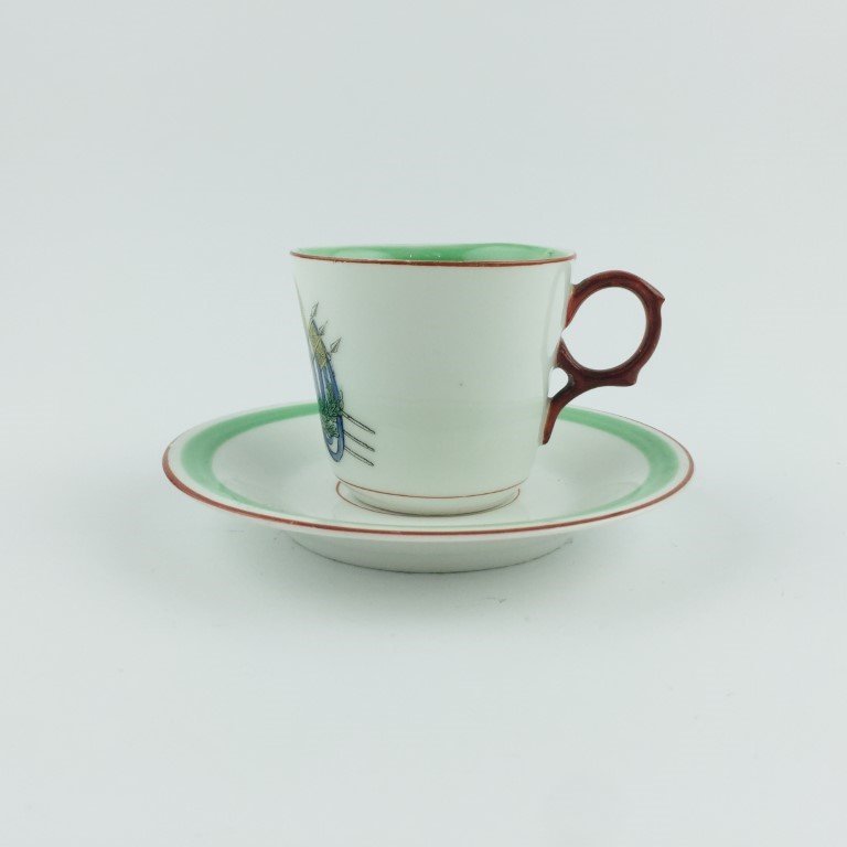 Plato y pocillo en porcelana decorado con escudo de armas uruguayo.