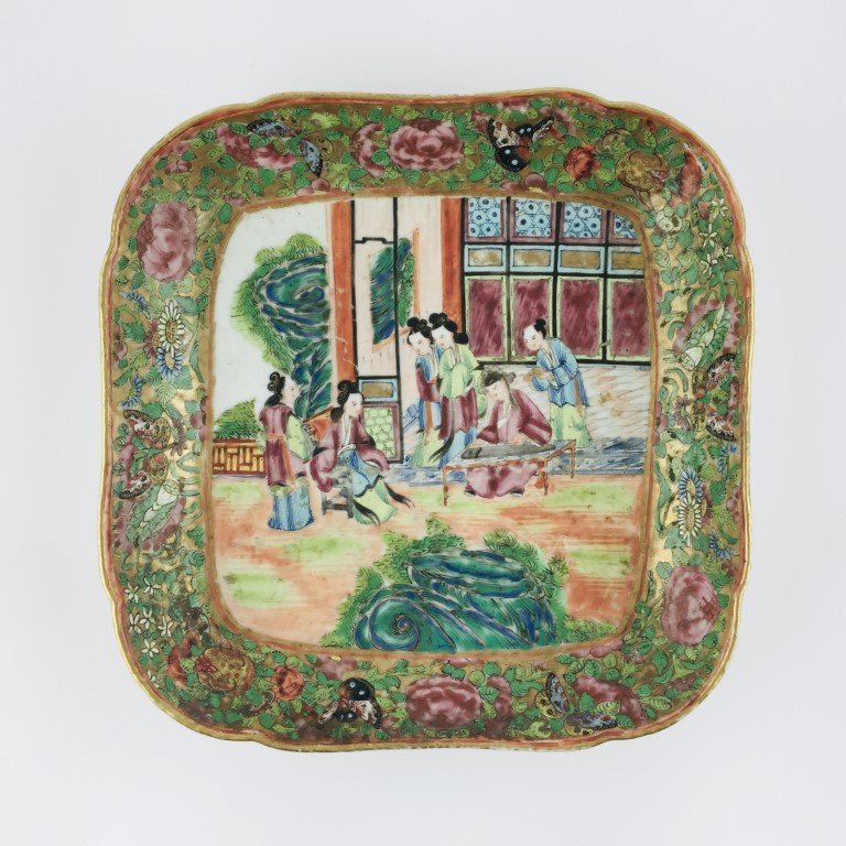 Par de platos cuadrados en porcelana Cantón antiguo decorados «escenas típicas» con borde en oro. 4.5 x 24 x 24 cm.