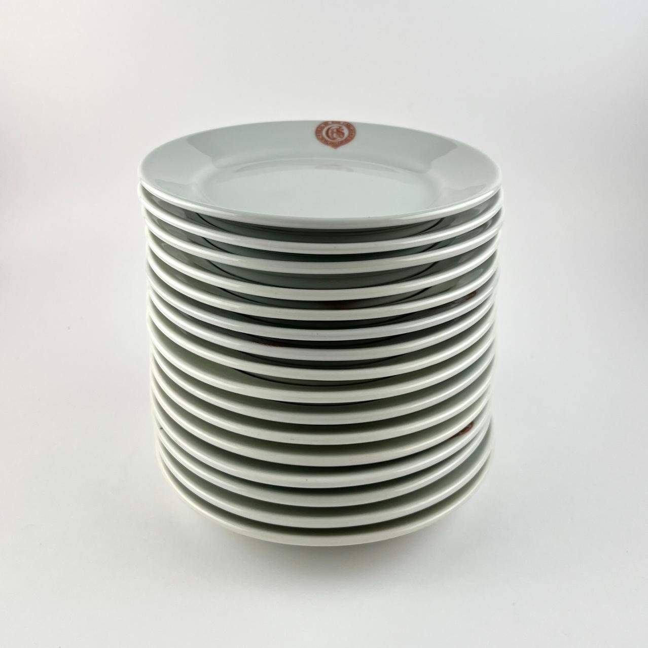 Dieciséis platos para postre en porcelana de Bavaria perteneciente al complejo turístico Real de San Carlos en Colonia del Sacramento. Diámetro 17,5 cm.