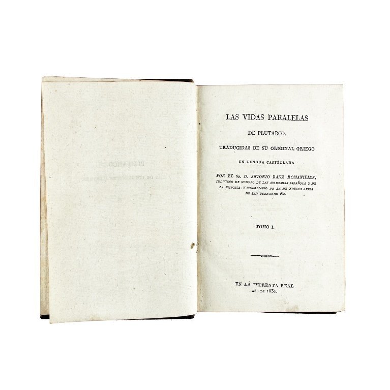 La obra fue traducida por Antonio Ranz Romanillos, miembro de número de la Real Academia Española, de la Real Academia de Nobles Artes de San Fernando y de la Real Academia de Historia, entre otras instituciones. Fue famosa su traducción de las “Vidas paralelas” de Plutarco. Esta obra clásica, escrita entre el 96 y el 117 d. de Cristo, era una fuente de consulta para los más destacados autores y su publicación en español fue muy bien recibida. Plutarco estructuró su ensayo comparando las biografías de distintos personajes griegos y romanos. Tal diálogo le permitió construir un ejercicio filosófico entre aquellas vidas paralelas, extrayendo del cruce entre las distintas personalidades, las más importantes lecciones históricas y morales.