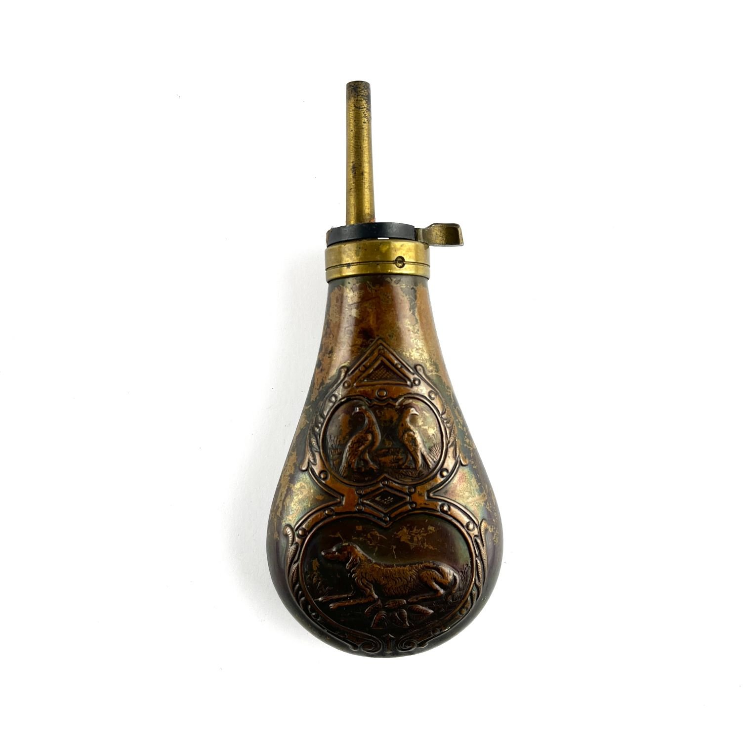 Polvorera en cobre estampado «aves y perros de cacería» con pico dosificador en bronce. Alto 18 cm.