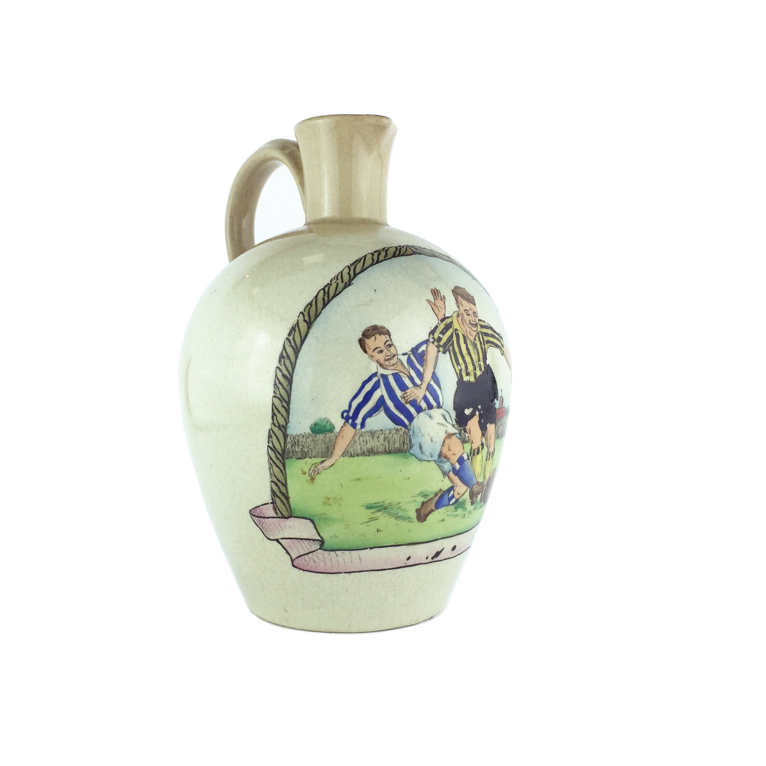 Porrón en Gres esmaltado con cartela pintada a mano. «Incidencias del juego Peñarol VS Universal c. 1930.» Pequeñas averías en pintura. Alto 18 cm. Diámetro 12 cm.