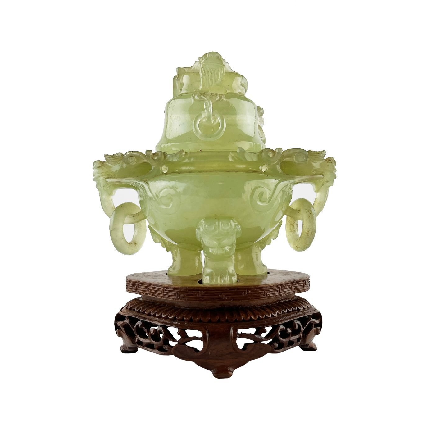 Potiche chino en jade verde esculturado «cabeza de dragones», con dos asas con arandelas. Tapa esculturada «dragón», con tres asas con arandelas. Tres patas esculturadas «garras». 13 x 14 x 8 cm. Presentado sobre peana en madera tallada y calada. Alto total 18 cm. Con pequeñas averías.
