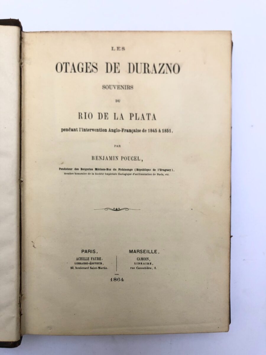 POUCEL, Benjamín: Les otages de Durazno souvenirs du Río de la Plata. París, Achille Faure Libraire-Éditeur. 1864. Ex Biblioteca Juan Carrera Roldán.