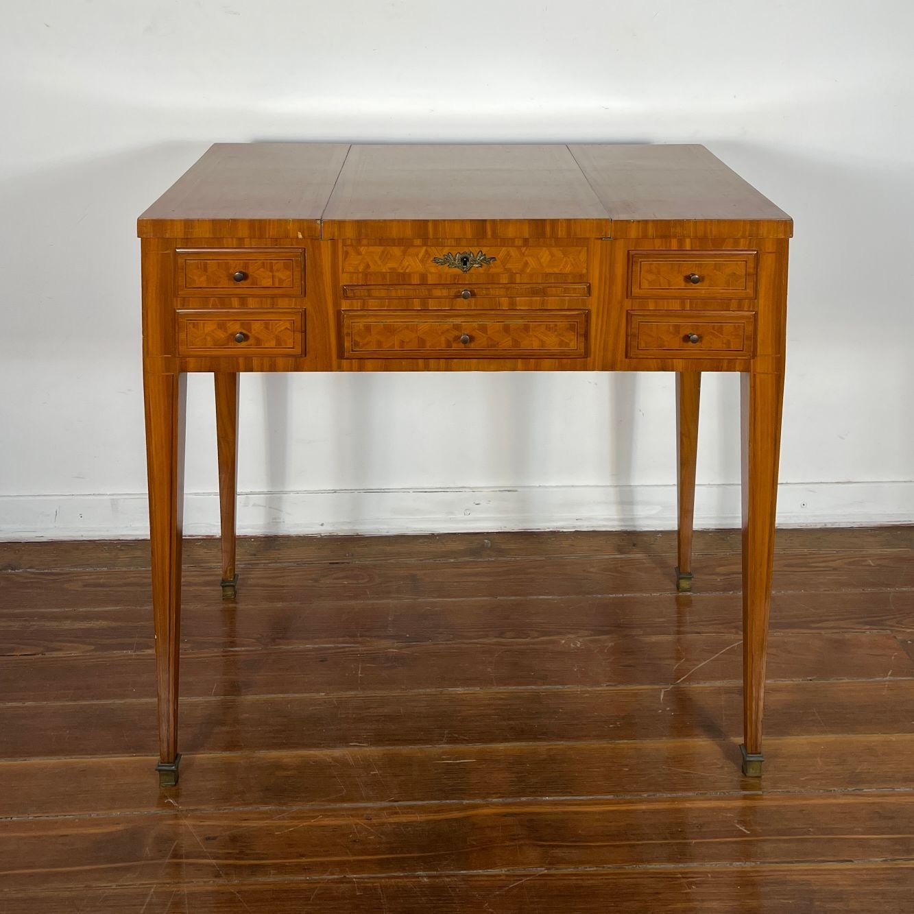 Poudruese francesa estilo Luis XV enchapada en palo de rosa con parqueterie. Tiradores, herrajes y regatones en bronce. 74 x 79 x 45 cm.
