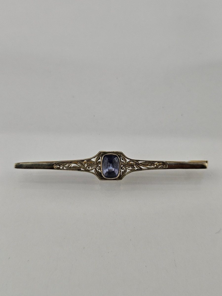 Prendedor art decó tipo barra en oro 18 K blanco y amarillo calado y decorado con piedra central color azul. 9 x 8 mm. Peso bruto 3 gr.