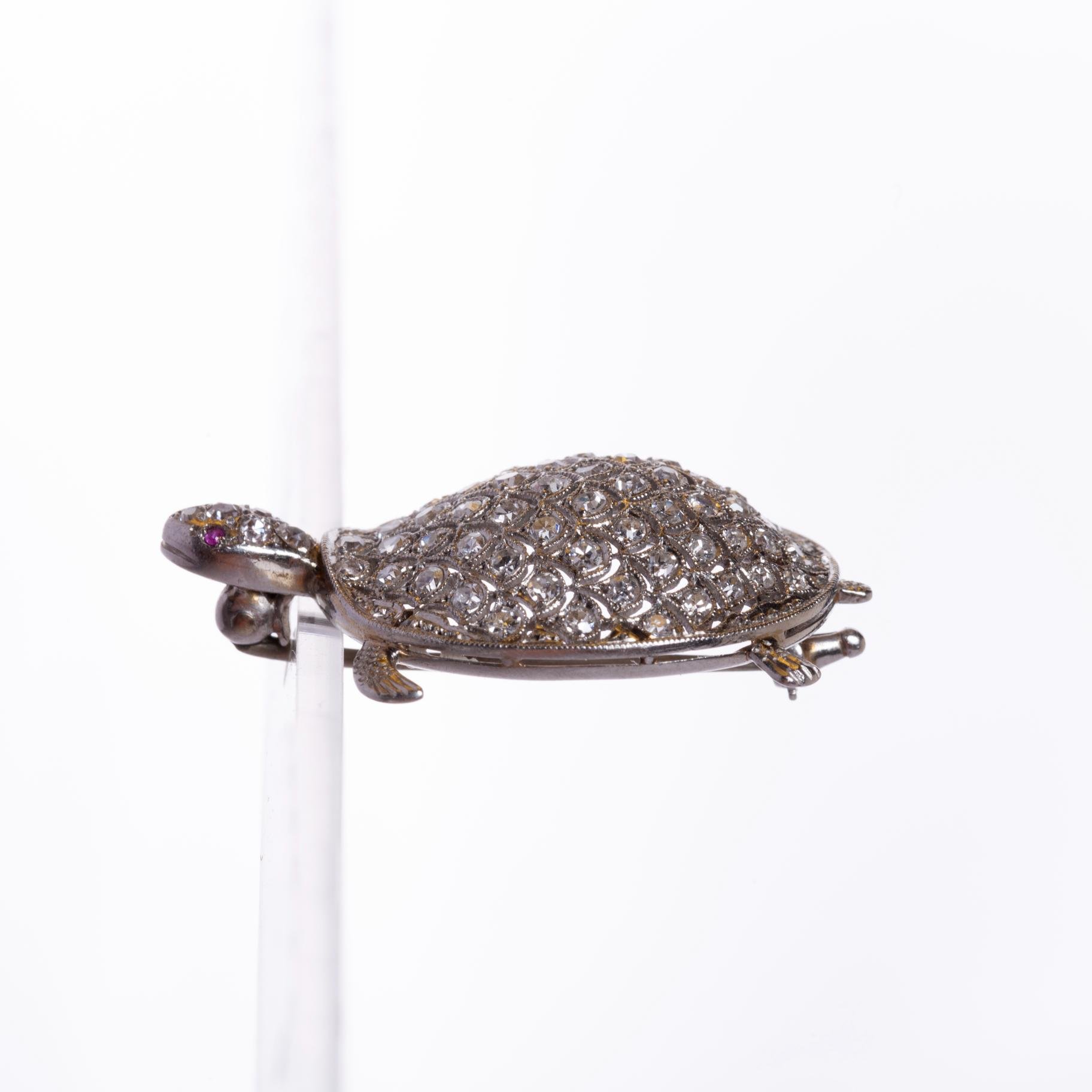 Prendedor en oro 18 K blanco esculturado «tortuga», totalmente decorado con brillantes, con ojos en zafiro. 15 x 31 mm. Peso bruto 5,3 gr.