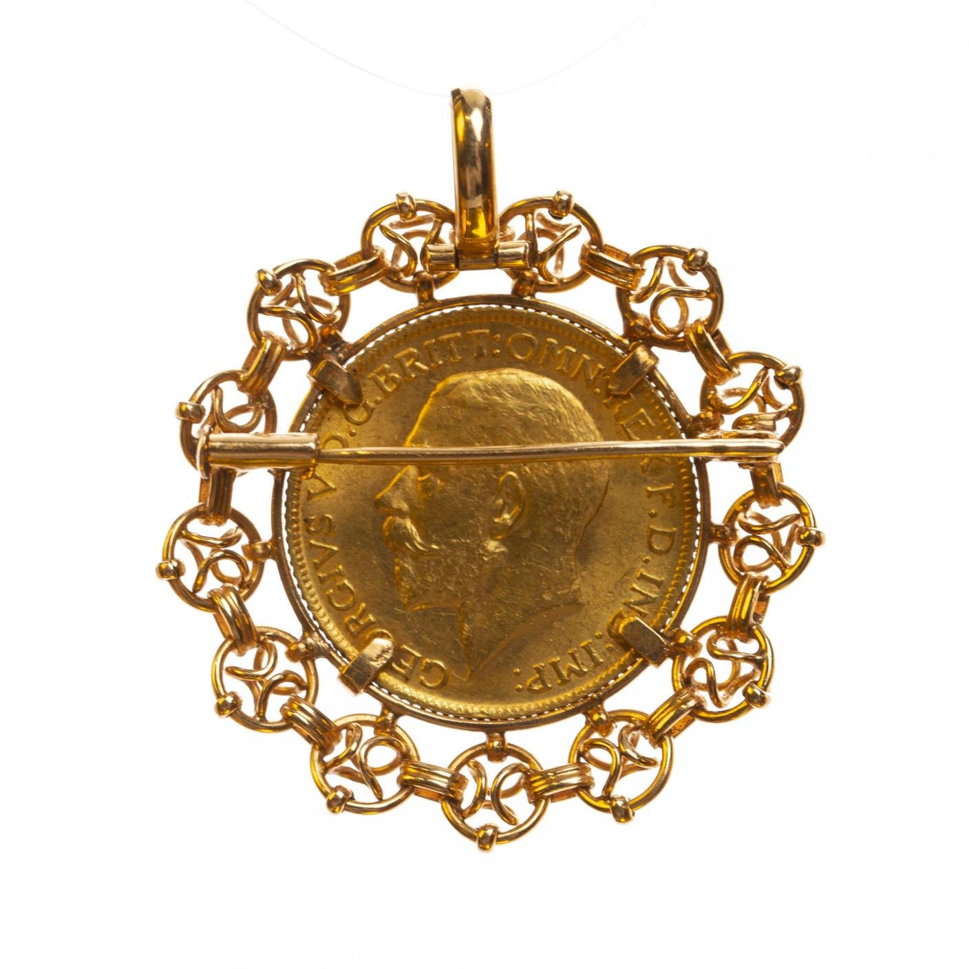 Prendedor colgante en oro 18 K amarillo con moneda británica en oro denominación 1 libra del año 1912. Diámetro 35 mm. Peso bruto 14,3 gr.