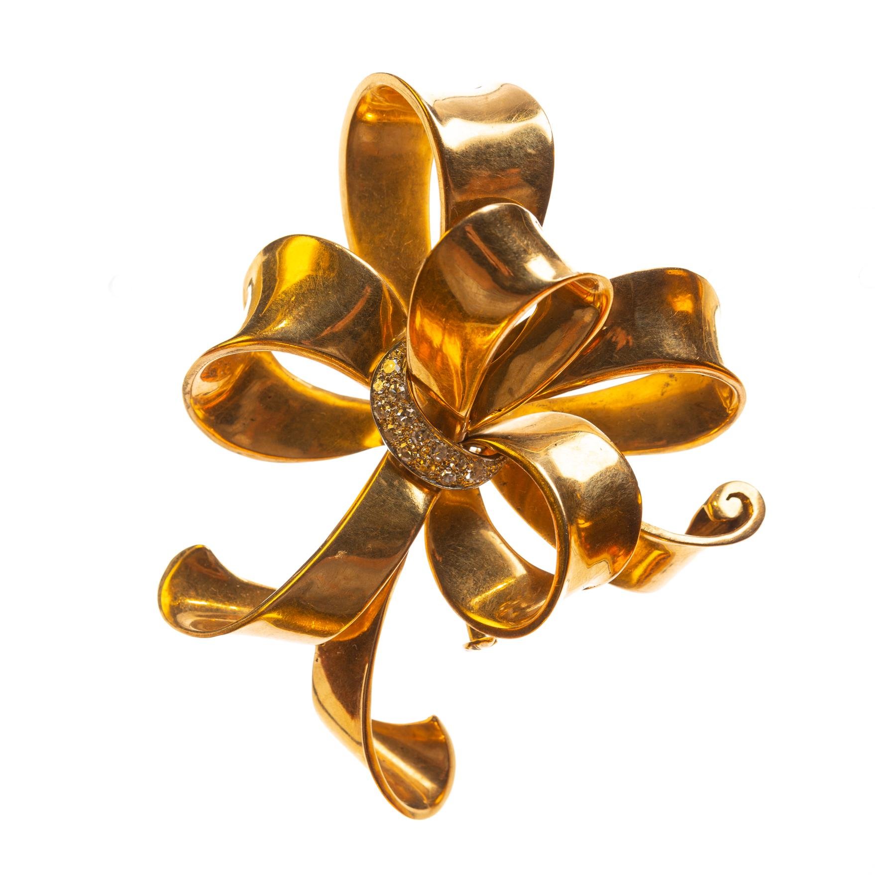 Prendedor tipo moño en oro 18 K amarillo con trece pequeños diamantes talla brillante con monturas en oro 18 K blanco. 62 x 75 mm. Peso bruto 31,8 gr.