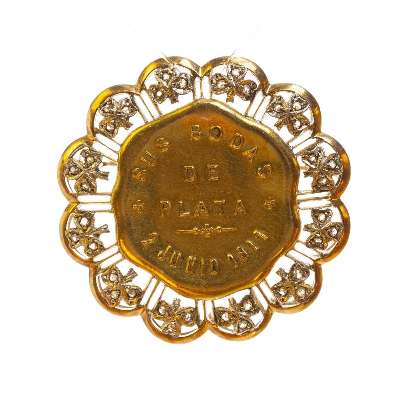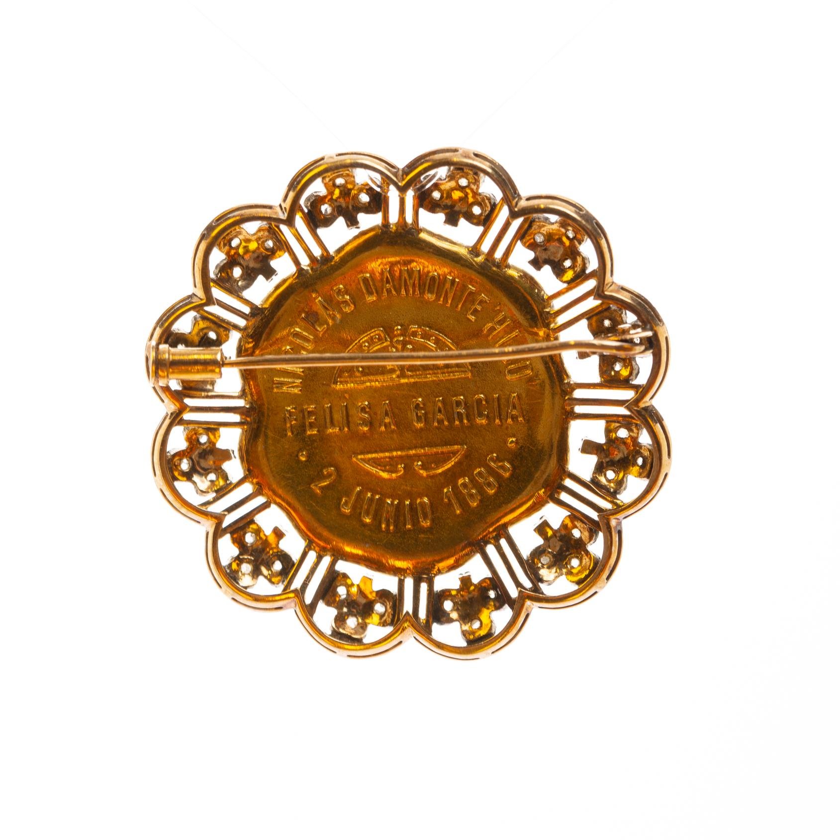 Prendedor en oro amarillo esculturado en forma de flor con tréboles de diamantes. Grabado con dedicatoria. Diámetro 42 mm. Peso bruto 23 gr.