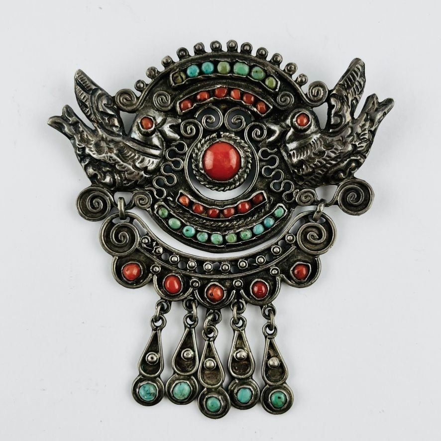Prendedor en plata calada y cincelada «aves» decorado con corales y turquesas. 80 x 65 mm.