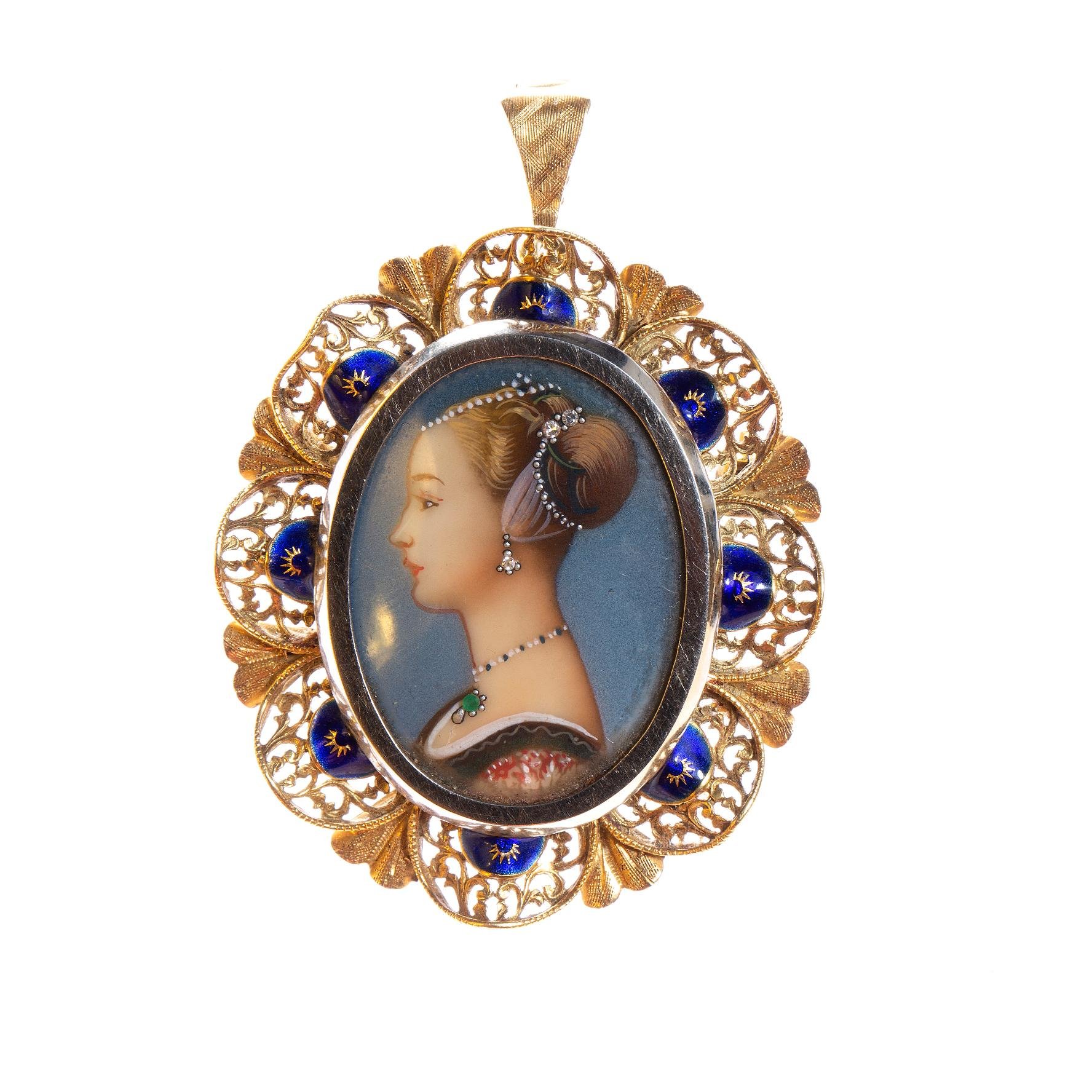 Prendedor colgante italiano en oro 18 K amarillo con miniatura central pintada a mano «dama» en esmalte sobre celuloide, con tres diamantes y un rubí. Marco en oro 18 K blanco calado y cincelado «hojas» con detalles en esmalte azul. Con punzón del orfebre Corletto. 45 x 39 mm. Peso bruto 12,4 gr.