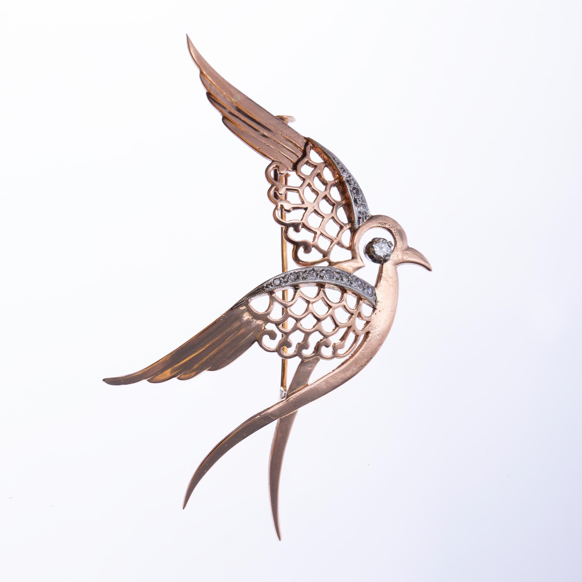 Prendedor en oro 18 K amarillo y blanco esculturado en forma de ave con once pequeños diamantes talla brillante. 44 x 71 mm. Peso bruto 9,5 gr.