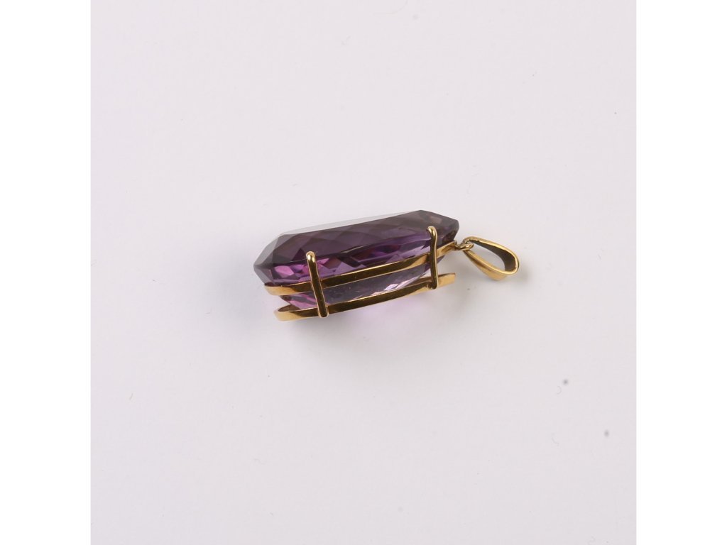 Prendedor en oro 18 K amarillo con amatista talla gota de 33 x 19 x 12.8 mm. Peso bruto 11.5 gr.