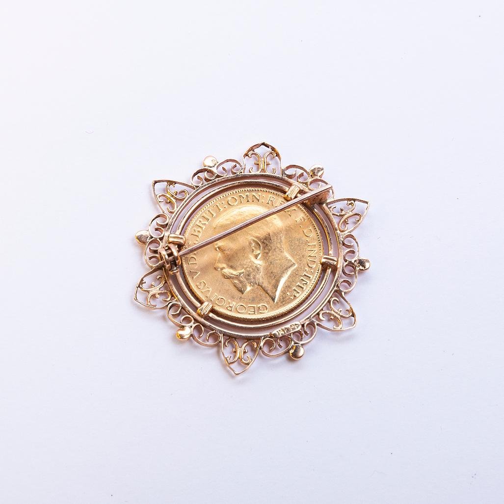 Prendedor en oro 18 K amarillo calado y decorado con una moneda británica denominación 1 libra esterlina del año 1923. Diámetro 39 mm. Peso bruto 13 gr.