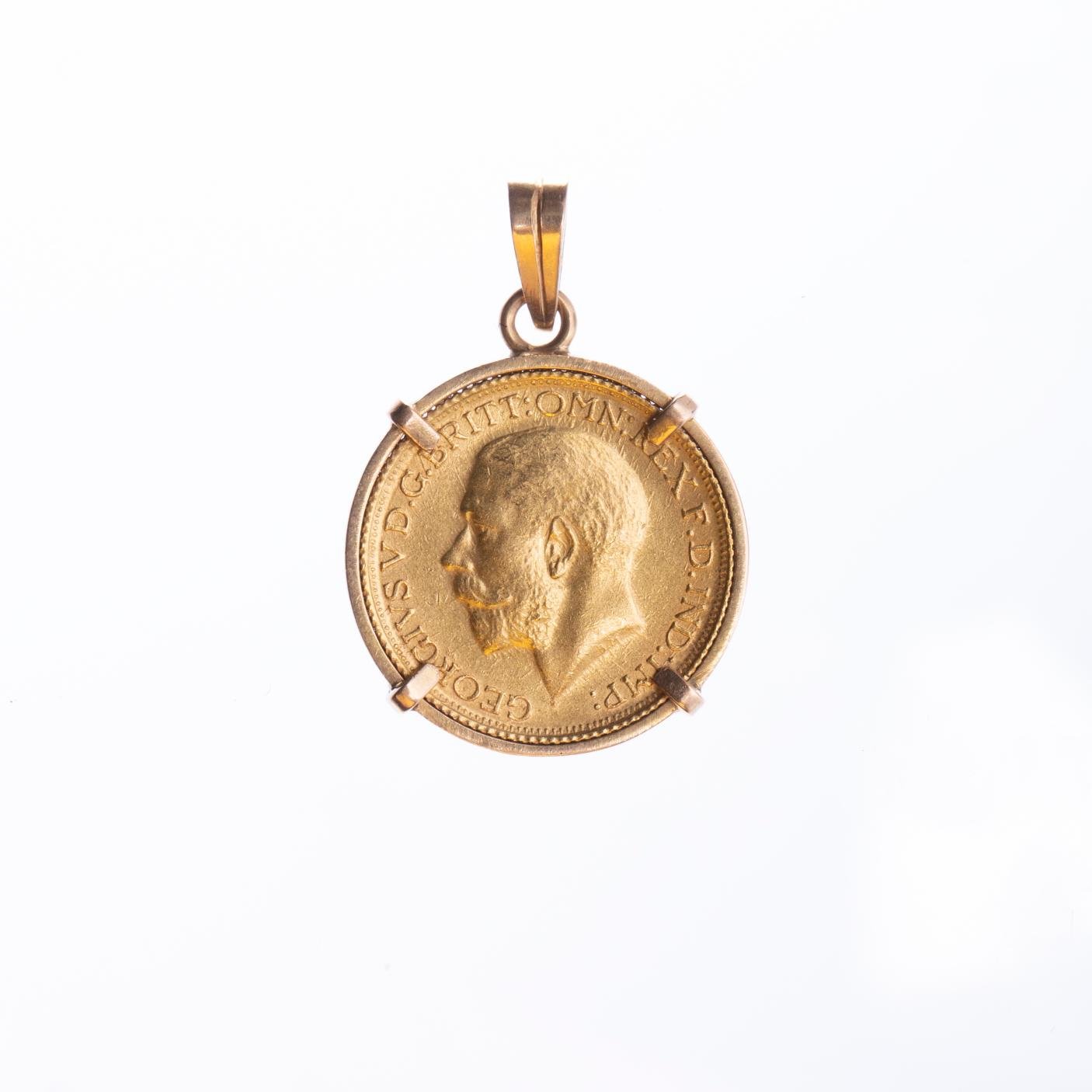 Prendedor en oro 18 K amarillo con una libra esterlina en oro del año 1916. Diámetro 24 mm. Peso bruto 10,5 gr.