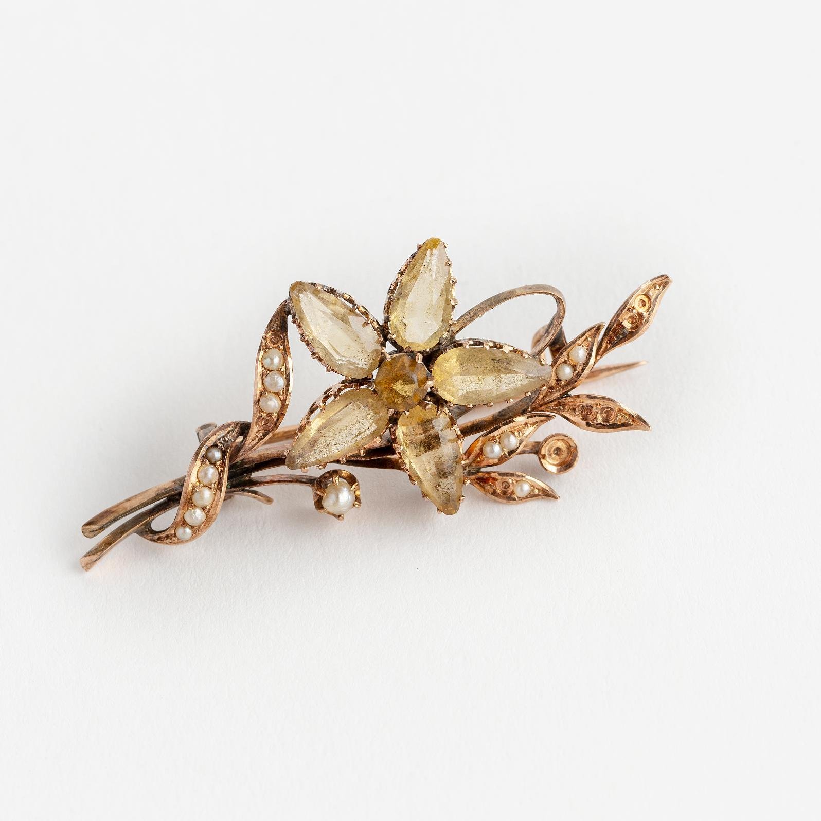 Prendedor en oro rosado esculturado tipo flor con seis topacios amarillos y catorce pequeñas perlas de cultivo, con espacio original para veintiuna. 20 x 49 mm. Peso bruto 4.8 gr.