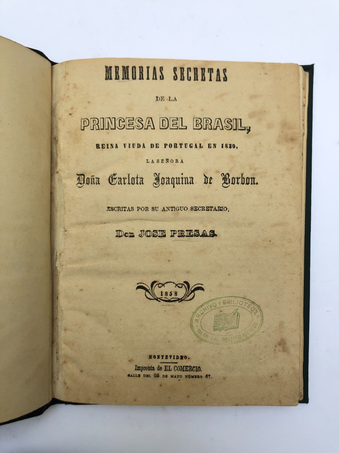 PRESAS, José: Memorias secretas de la princesa de Brasil, reina viuda de Portugal en 1830, la señora doña Carlota Joaquina de Borbón. Montevideo, imprenta de El Comercio. 1858. Encuadernación con lomo de cuero. Con exlibris de Pablo Blanco Acevedo.