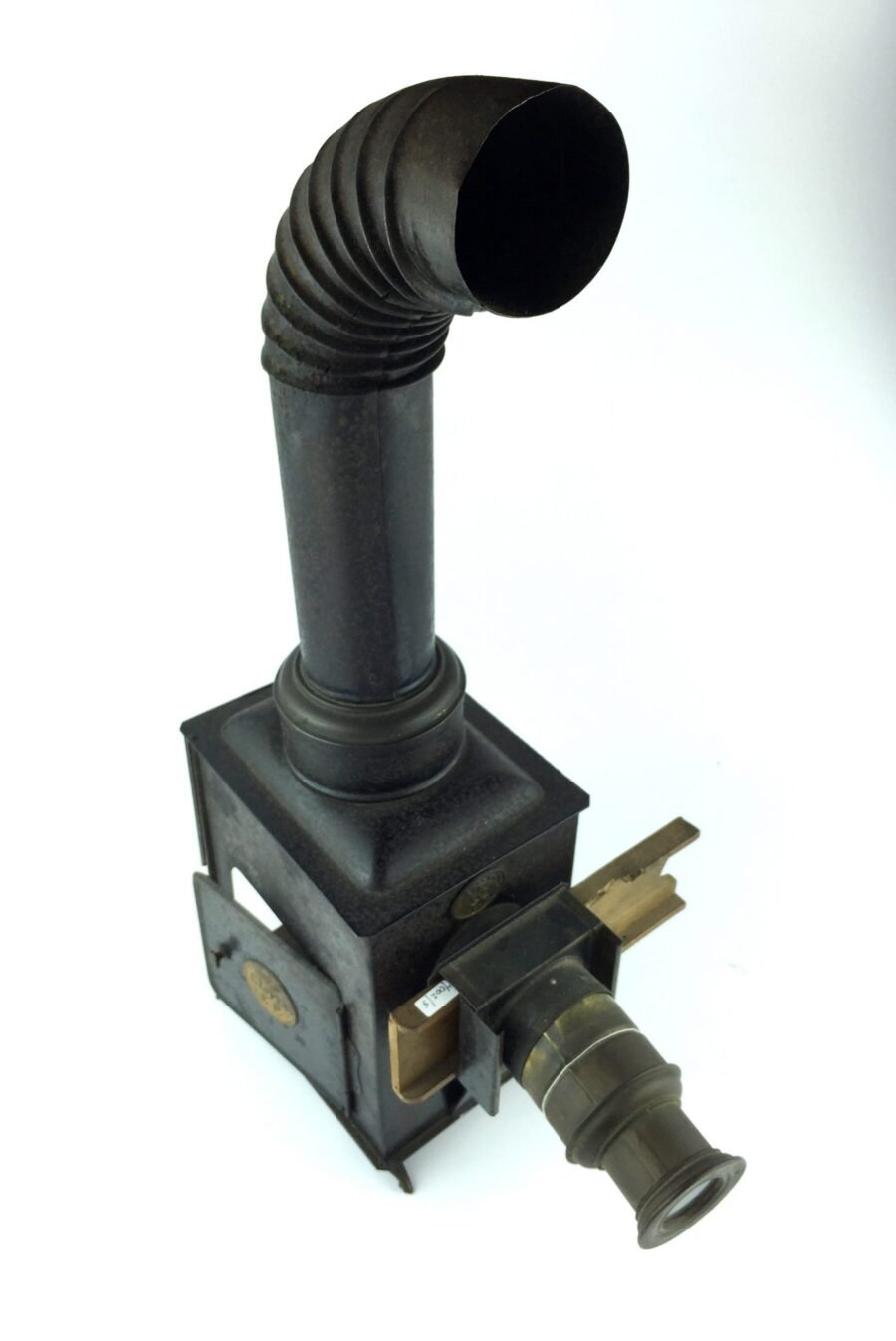 Proyector de imágenes «Linterna Mágica», en chapa y bronce. Fabricado por Ernst Plank (1866-1932). 45 x 25 x 12 cm. Con averías.