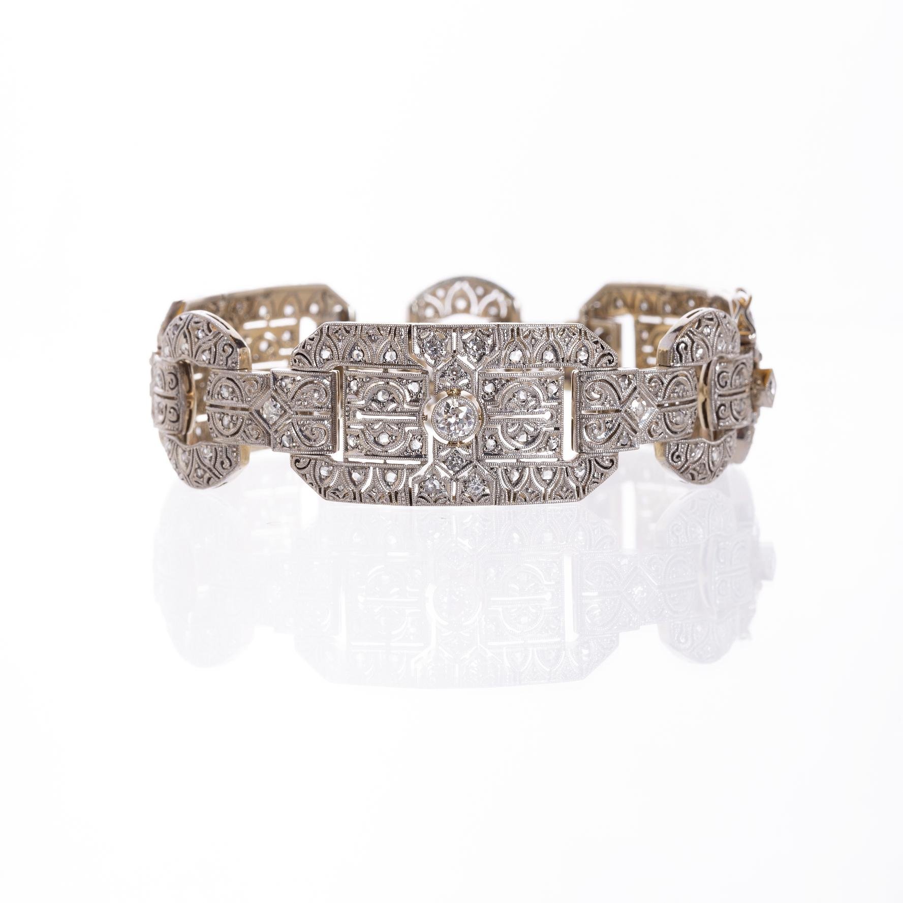Pulsera art decó en tres plaquetas de platino con un pequeño diamante talla brillante en cada una. Totalmente decorada con diamantes. 18 x 185 mm. Peso 37 gr.