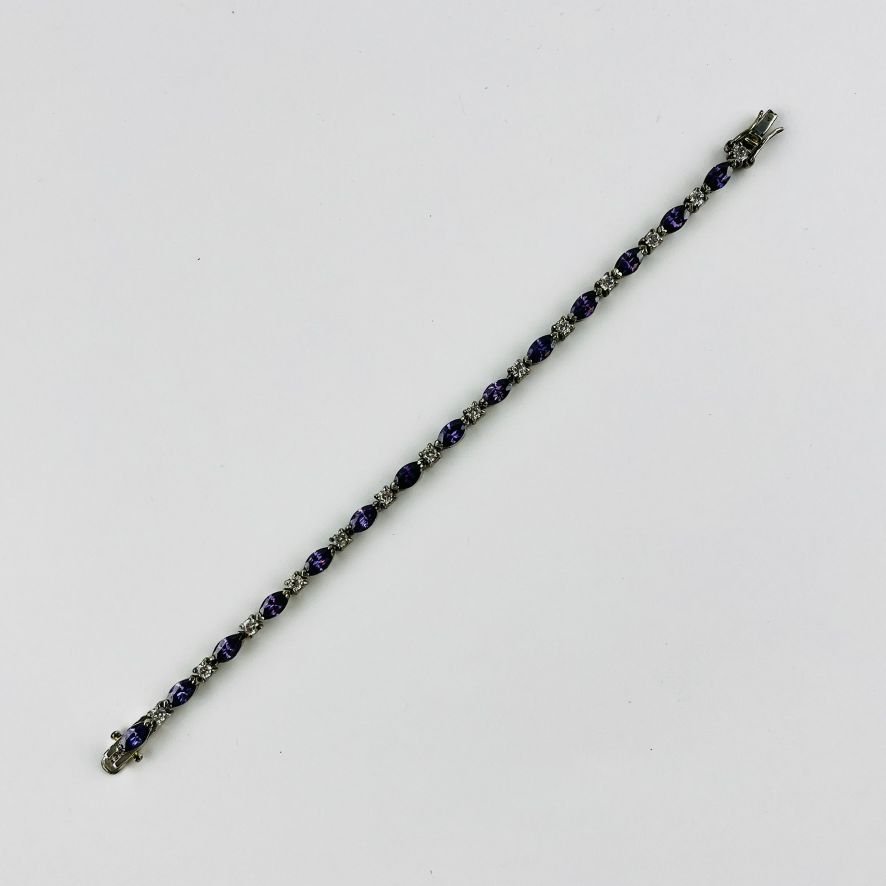 Pulsera articulada en metal plateado decorada con amatistas y zirconias.