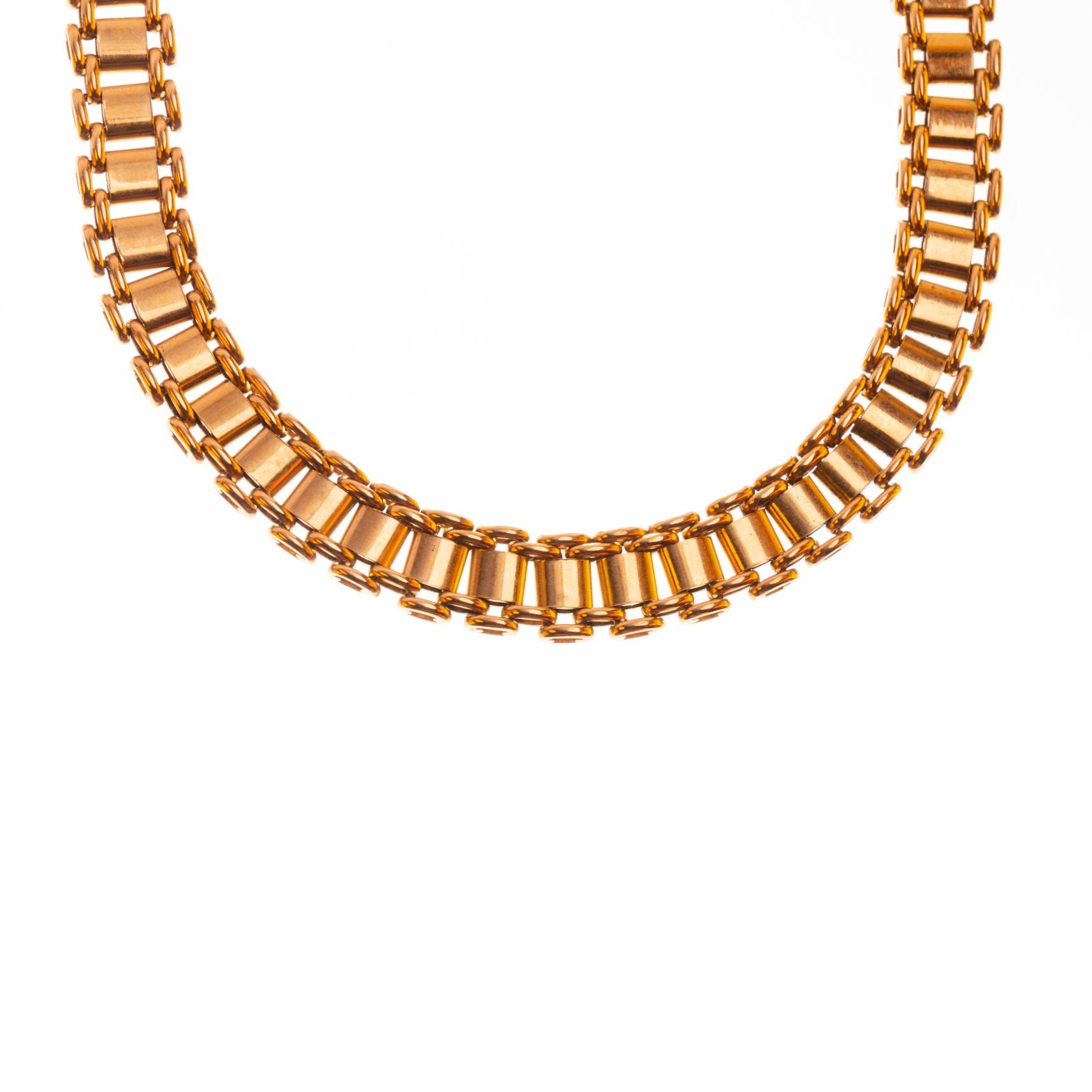 Pulsera en canutillos y eslabones de oro 18 K amarillo. Ancho 9 mm. Largo 190 mm. Con cadenilla de seguridad. Peso 18,3 gr.