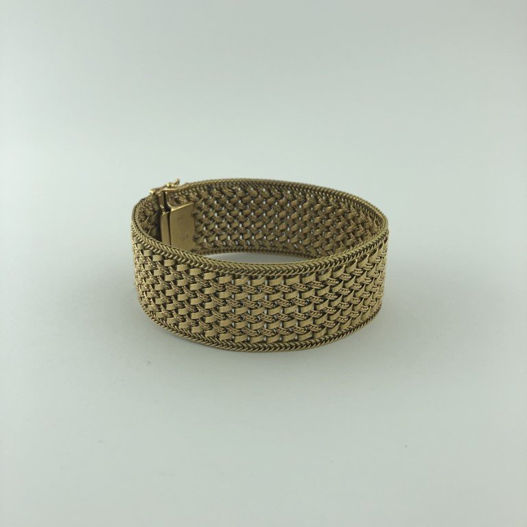 Pulsera tipo brazalete en oro 18 K amarillo trenzado. 185 x 25 mm. Peso bruto 50 gr.