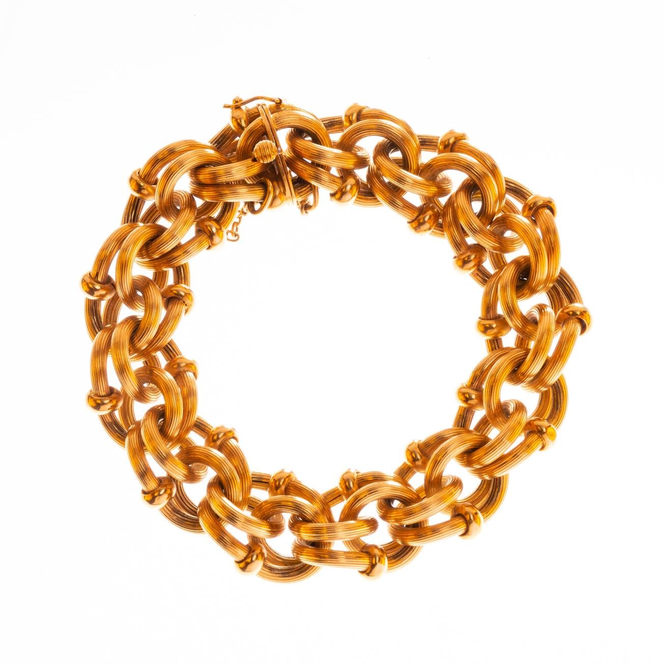 Pulsera en eslabones de oro 18 K amarillo. Diámetro 19 mm. Con cadenilla de seguridad. Peso 53 gr.