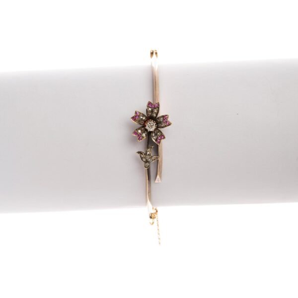 Pulsera rígida en oro 18 K amarillo esculturada en forma de flor con diamante central talla brillante de 0,15 ct aprox. acompañado por quince pequeños rubíes y veintiocho diamantes. Con cadenilla de seguridad. Diámetro interno 61 mm. Peso bruto 8,6 gr. En su estuche original de la joyería Carassale de Montevideo